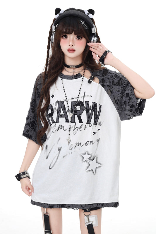 サブカルチャースターホールステッチショルダーデザインニッチルーズTシャツ