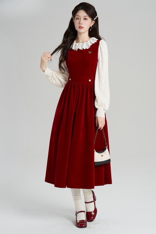レトロフレンチレッドチェックサスペンダーワンピース+フリルスリーブブラウス