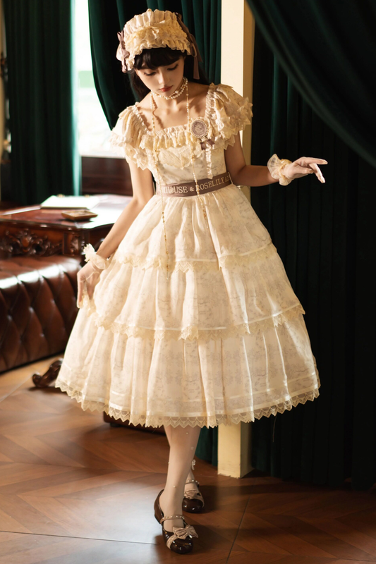 フレンチエレガンスフローラルロリータドレス+バッジ+ヘアバンド+カチューシャ