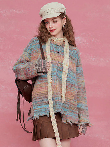グラデーションボーダーニットドレス+ボウタイニットショートカーデ