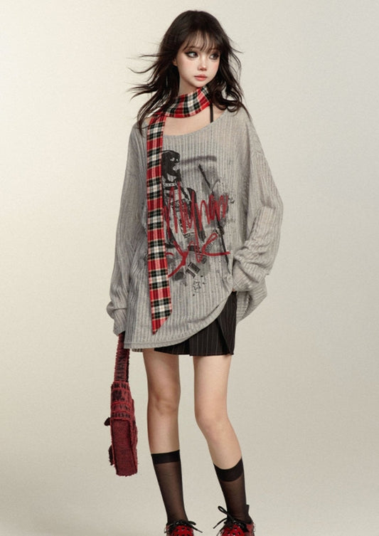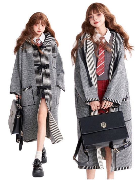 カレッジスタイルグレーレトロフードニットロングカーディガン