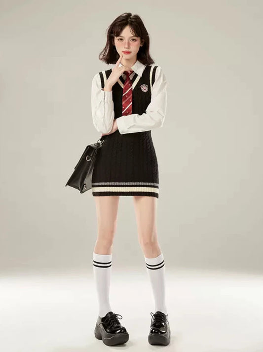 カレッジスタイルネクタイホワイトシャツ+Vネックニットベストドレス
