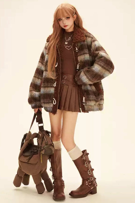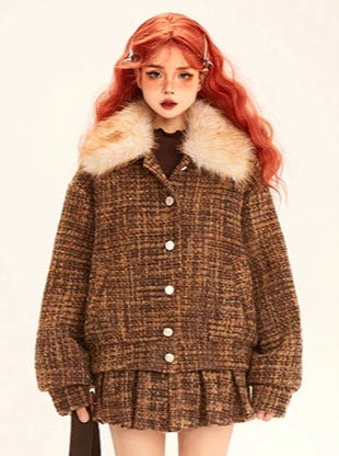 カレッジスタイルスーツファーカラーブラウンチェックジャケット+プリーツスカート