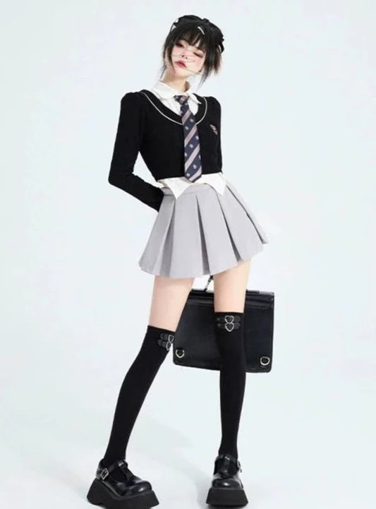 カレッジスタイルスーツスリムフィットショートシャツ+ショートニット+スカートセット