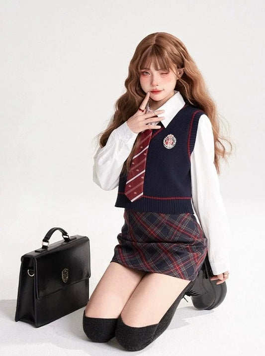 アメリカンカレッジスタイル JK スーツニットベスト + ネクタイシャツ + スカートセット