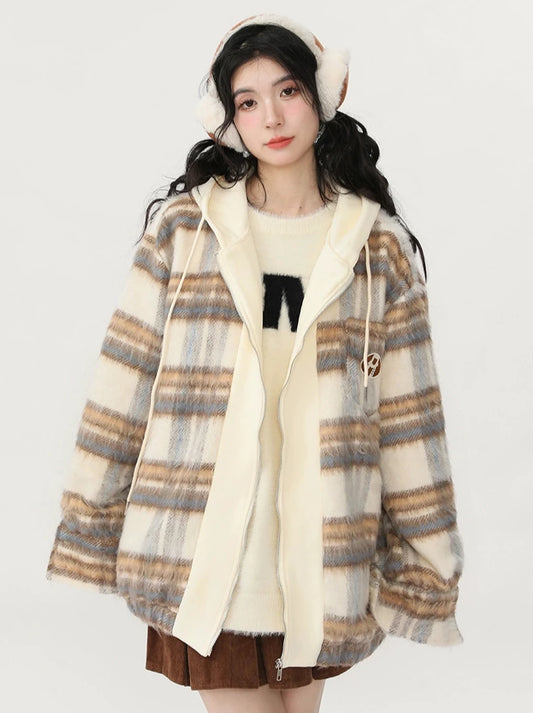 アメリカンレトロチェックフード付きルーズフェイクツーピースウールジャケット