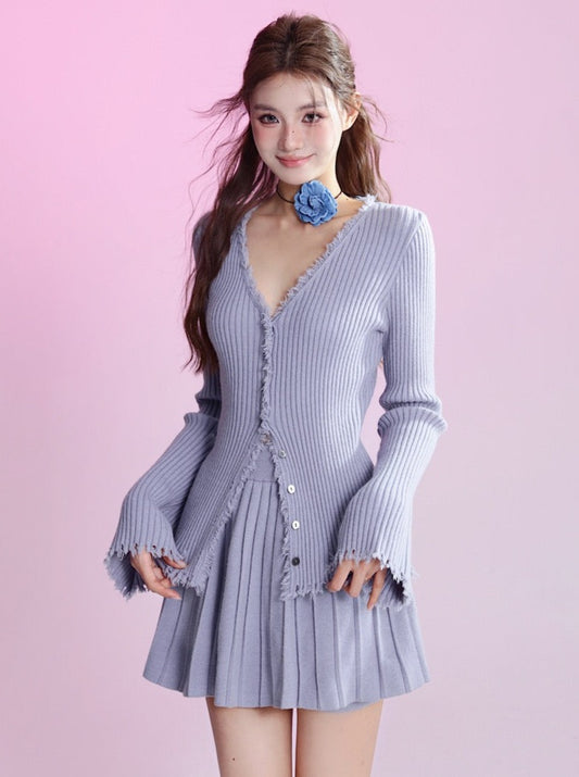 ブルーピュアラストストライプタッセルニットカーディガン+プリーツスカート