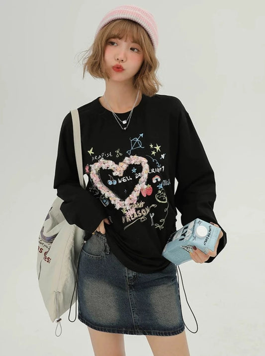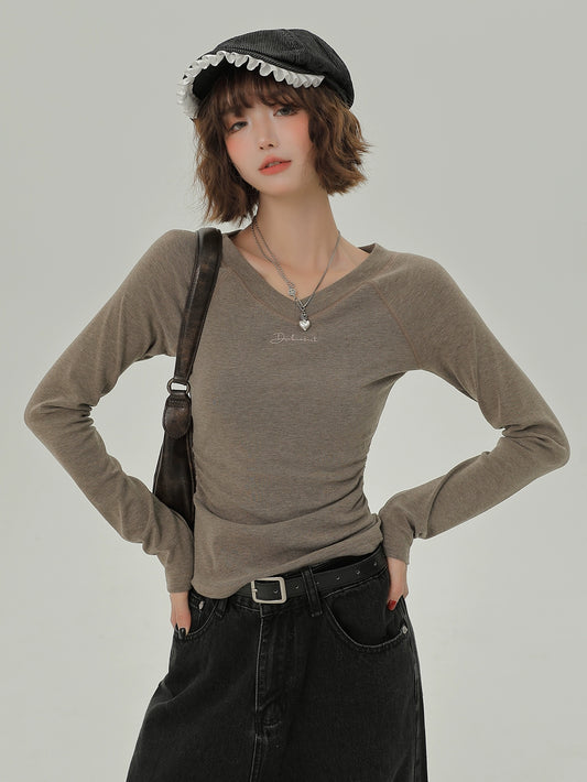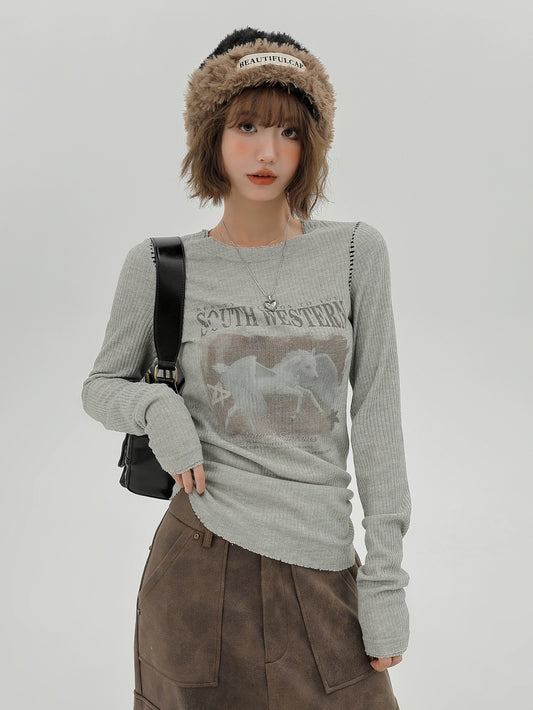 アメカジモードレトロホーズデザインスリムフィットトップス