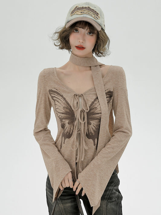アメリカンレトロバタフライプリントスリムイレギュラートップス