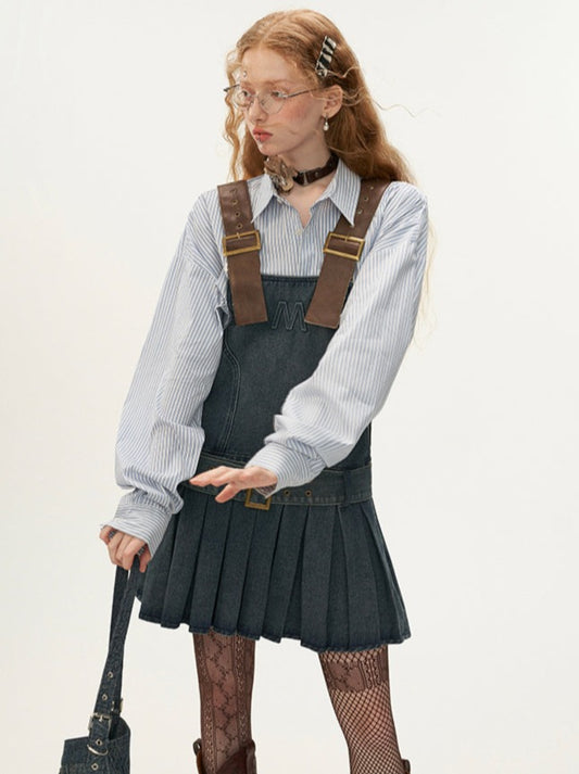 レザーベルトロゴデニムプリーツサスペンダースカート