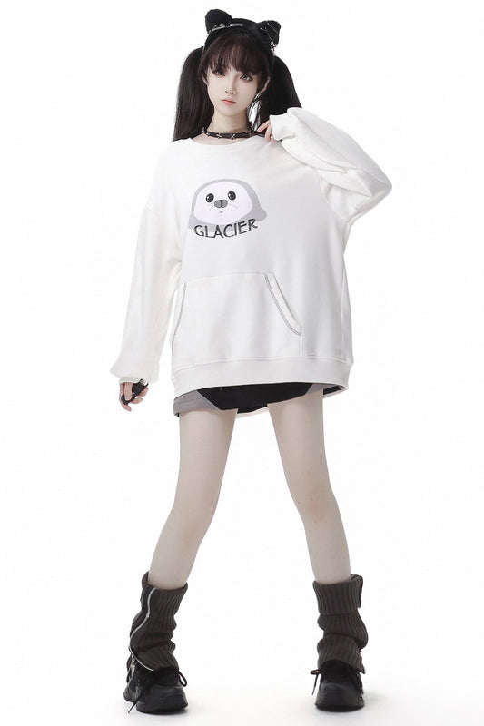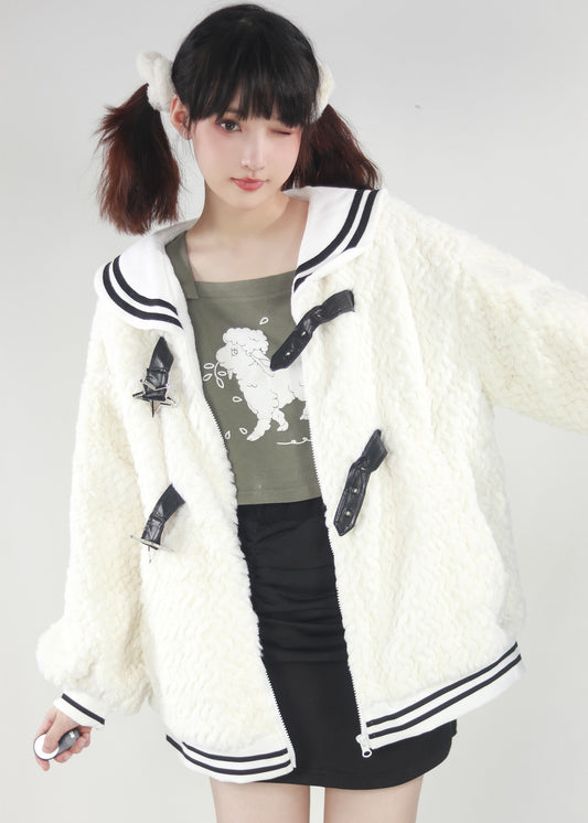うさ耳フーディー&セーラーフェイクファーコート+オフショルシーププリントトップス+スカート