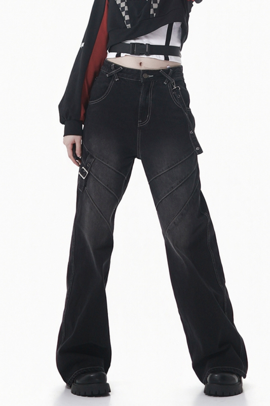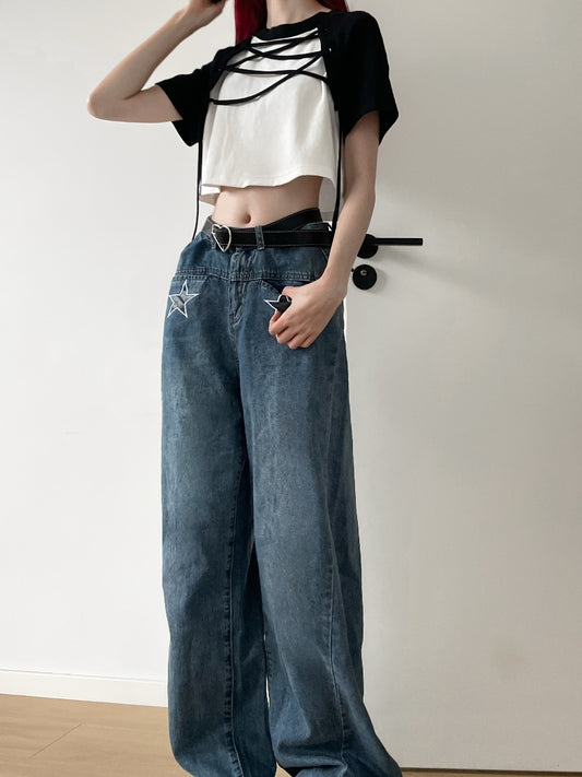 y2kダークブルートップス+チェックビスチェ+アシメスカート