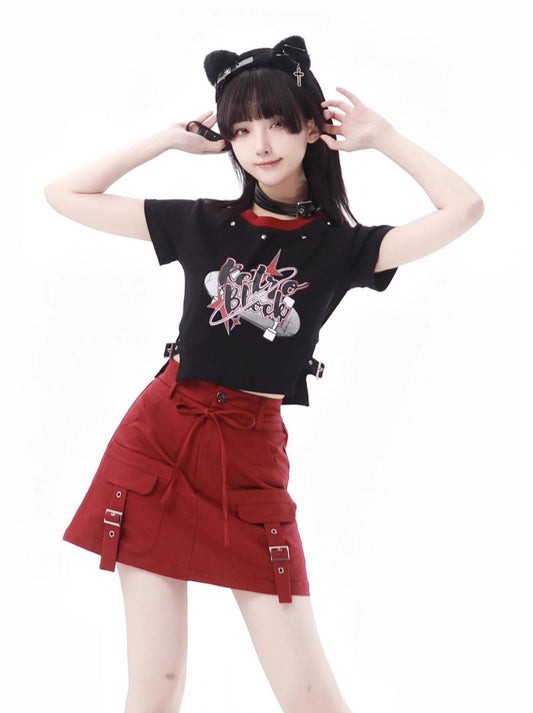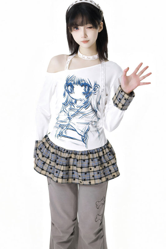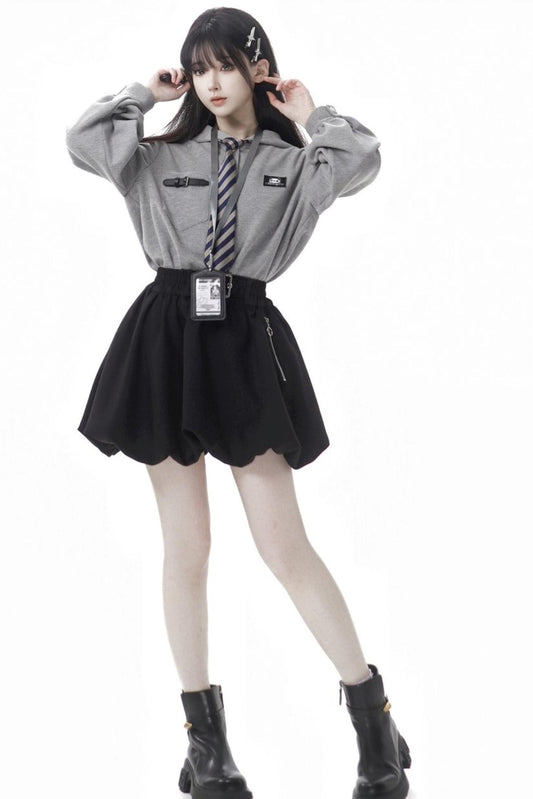 Y2Kフードショートトップス+ネクタイ付きノースリーブシャツ+チェックキュロット