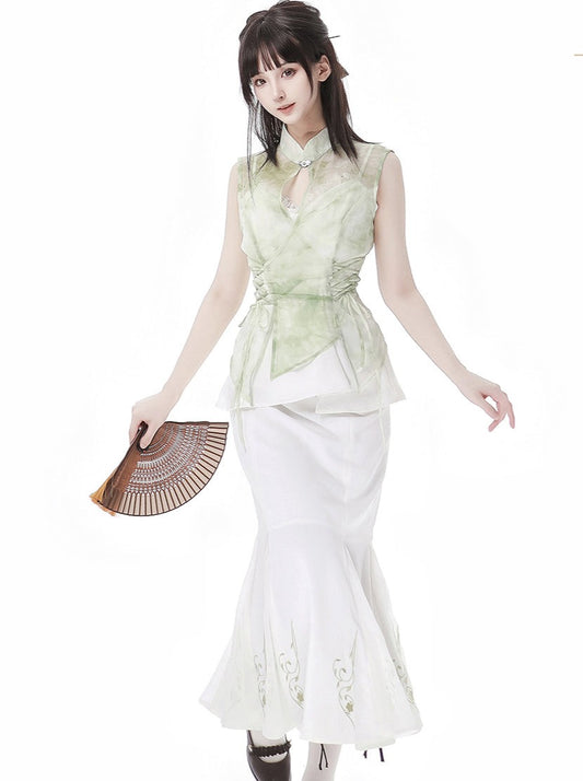 【予約商品】ホワイトグリーンノースリーブエレガントトップス+キャミソール+マーメイドスカート
