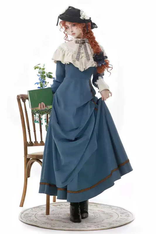 【予約商品】レトロビブカラーエレガントブルーイレギュラースカートドレス