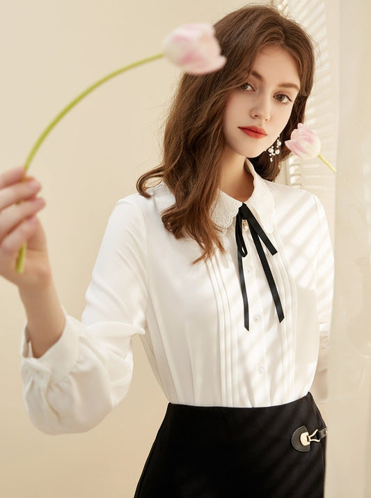 ラペルリボンパフスリーブシフォンシャツ