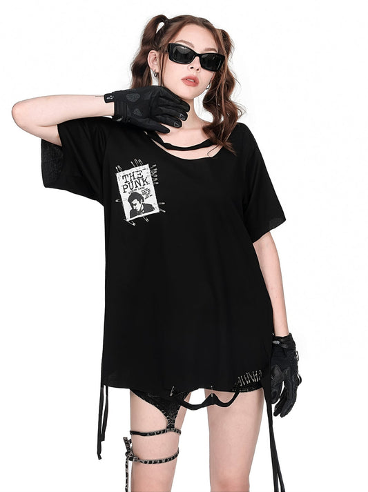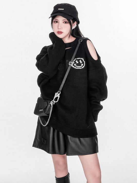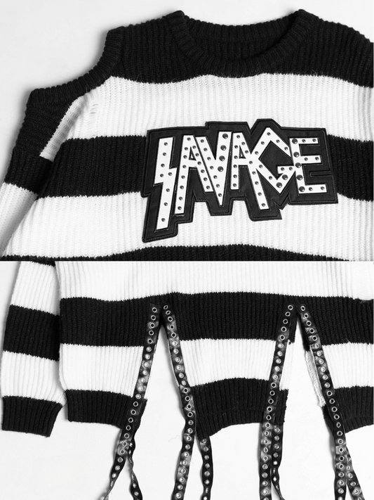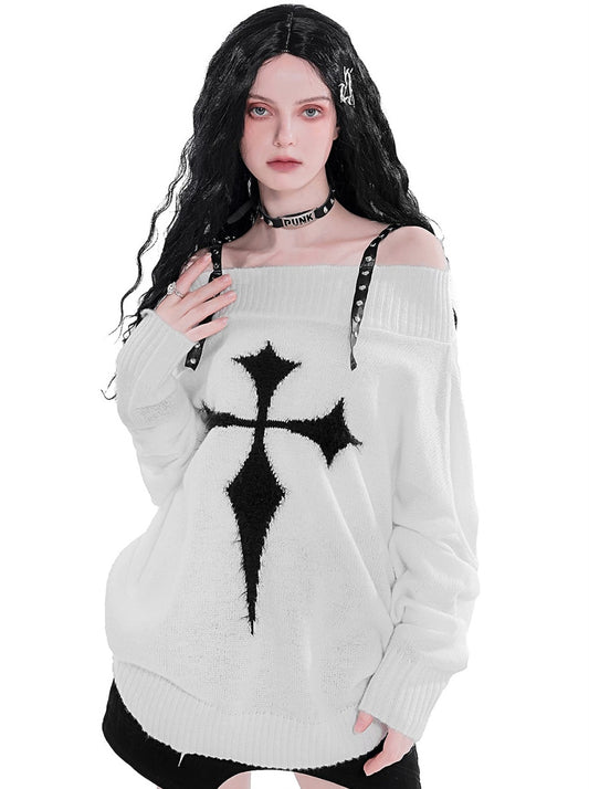 クロスパターンパンクリベットショルダーストラップオフショルニットセーター