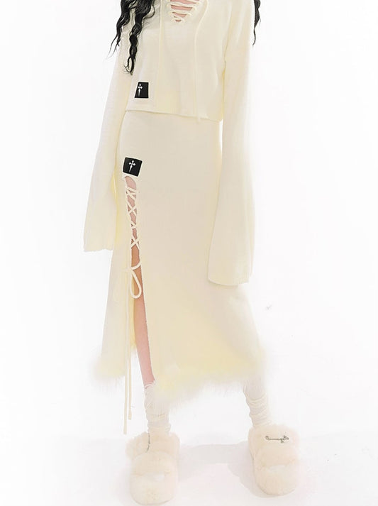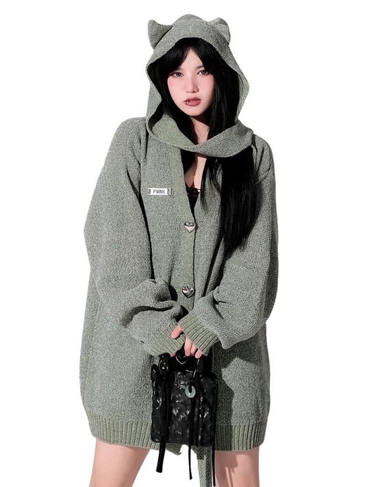 グレーグリーンオリジナルフード付き子猫耳ニットカーディガン+レッグウォーマー