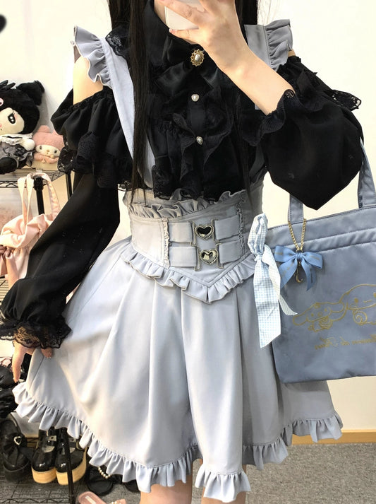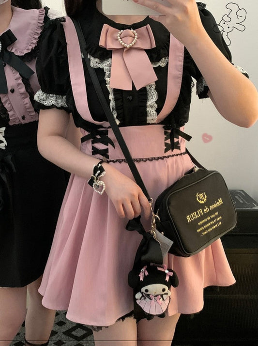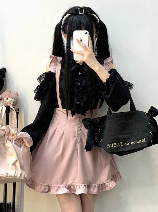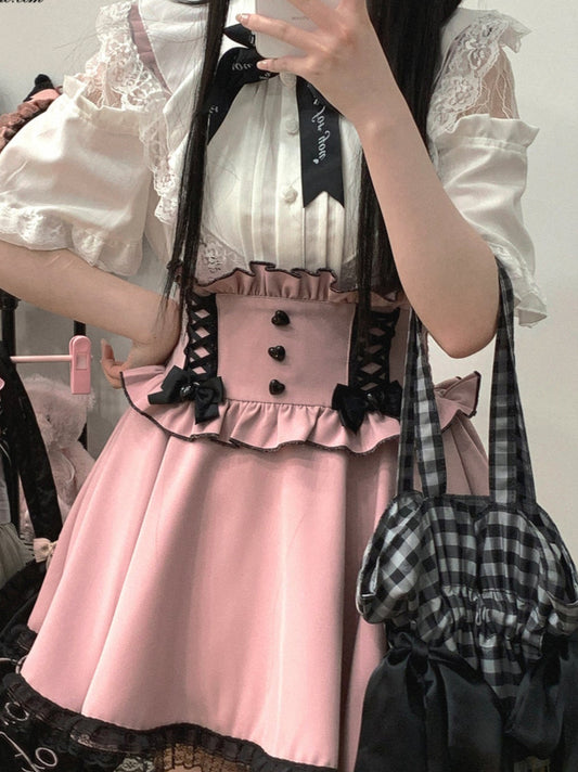 リボンショルダーレザーバックルサスペンダースカート【予約商品】