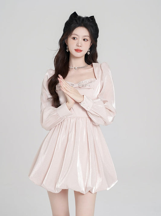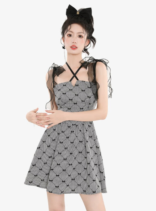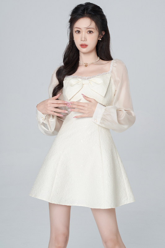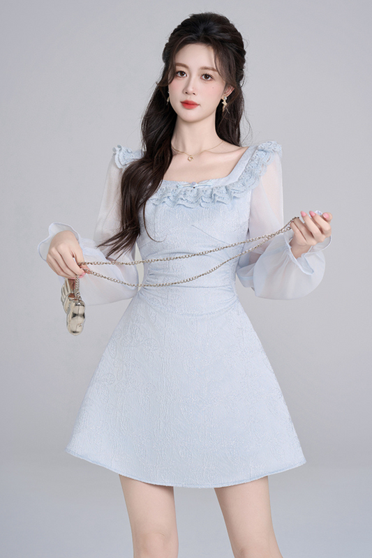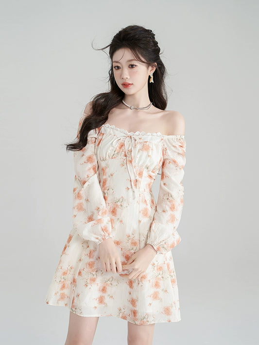 オフショルシアースリーブレースアップジャカードサスビスチェレイヤードワンピース