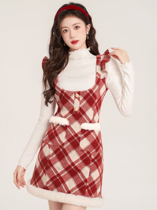 クリスマスレッドタータンチェックサスペンダーワンピース