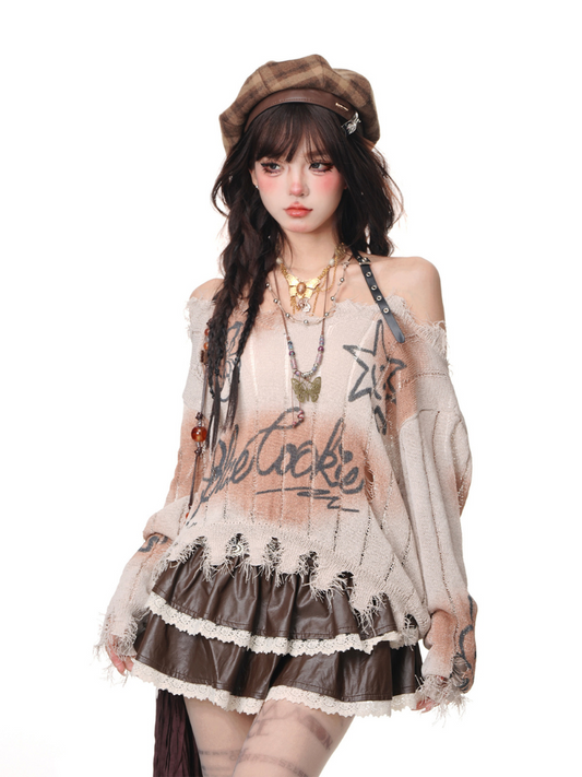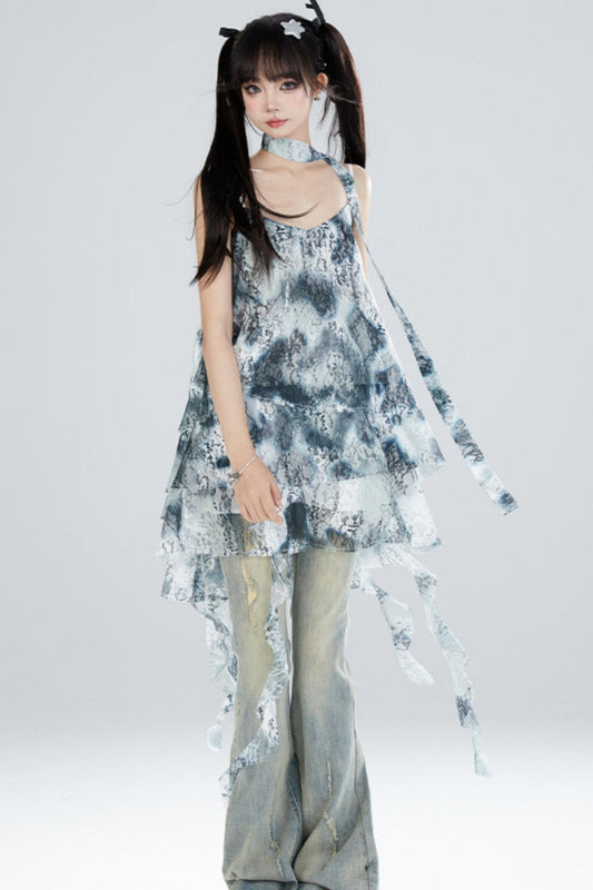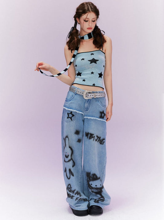 ブルーキャミソールトップス+スカート+スプレーアートデニムパンツ