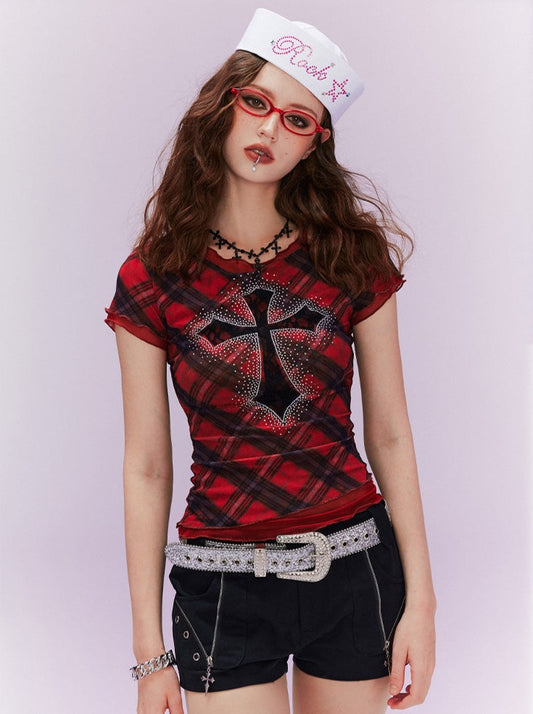 レトロミレニアルチェックトップス+ジップアップショートパンツ