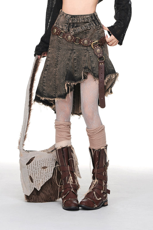 ダークブラックスターレザーバックルデニムy2kレッグウォーマー