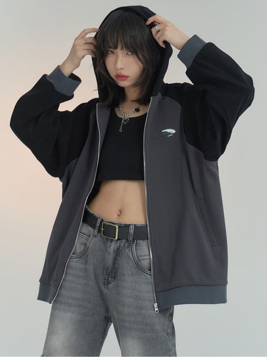 ルーズコントラストカラーフーディーカーディガントレーナー