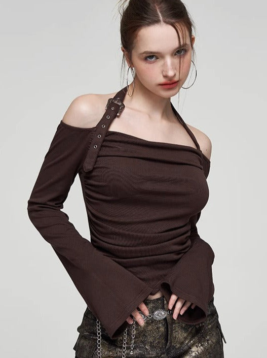 レースフリルスタンドカラーオフショルレイヤードトップ
