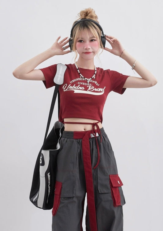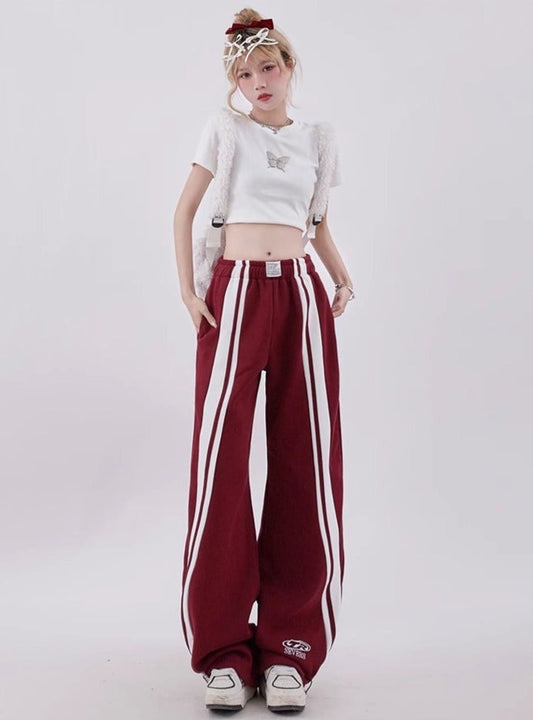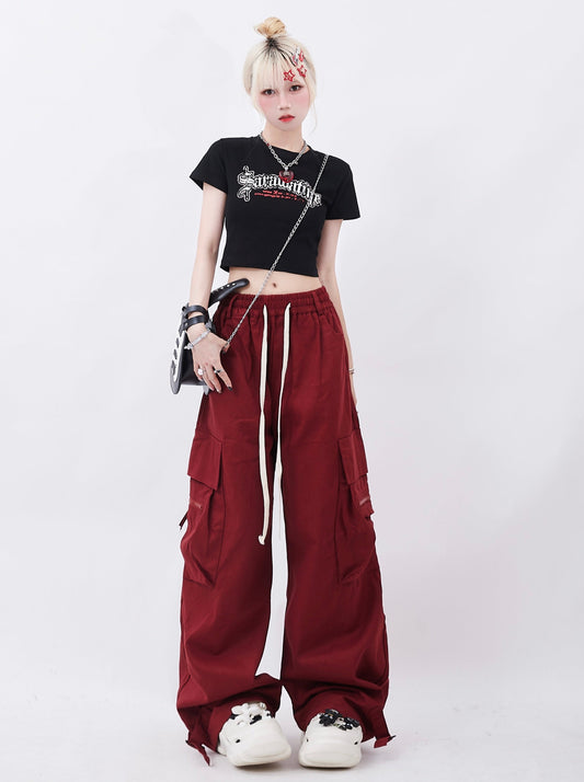 レッド&ブラックアメリカンクールルーズドロストパンツ