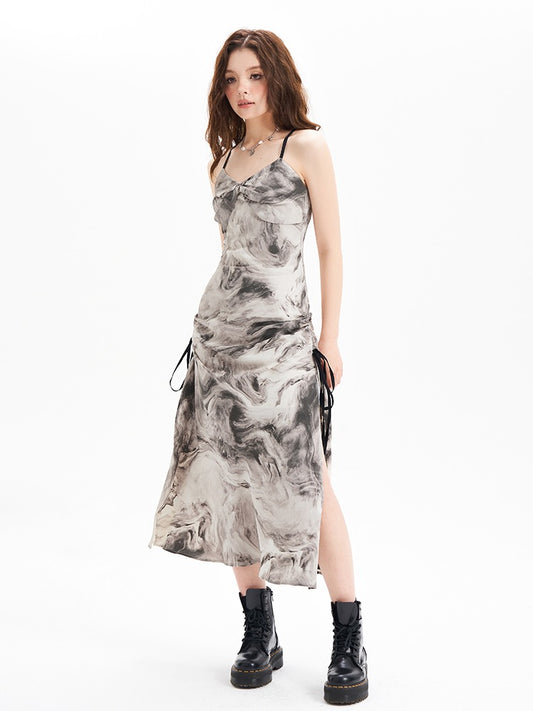 インクマーブルサイドスリットバッククロスストラップワンピース