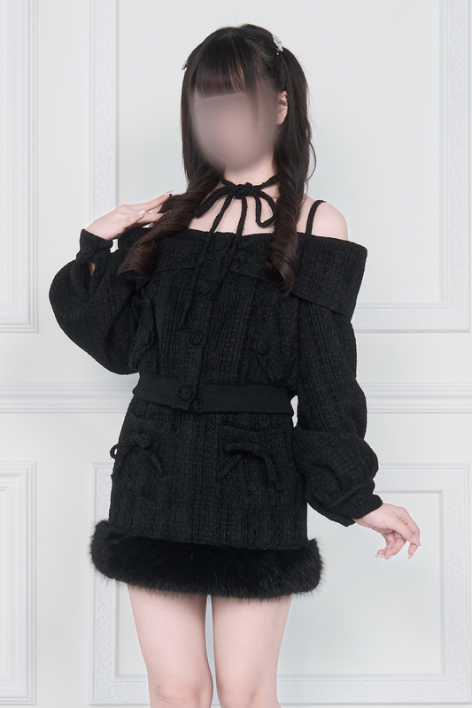ベアジャケット+ムースニットサスペンダートップス+ショートパンツ