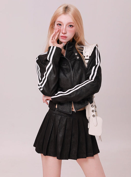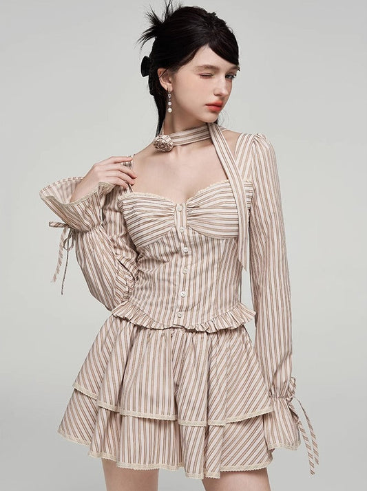 Code Rabbit Original schulterfreies gestreiftes Hemd + asymmetrischer gestreifter Stufenrock + Kreuzkrawatte