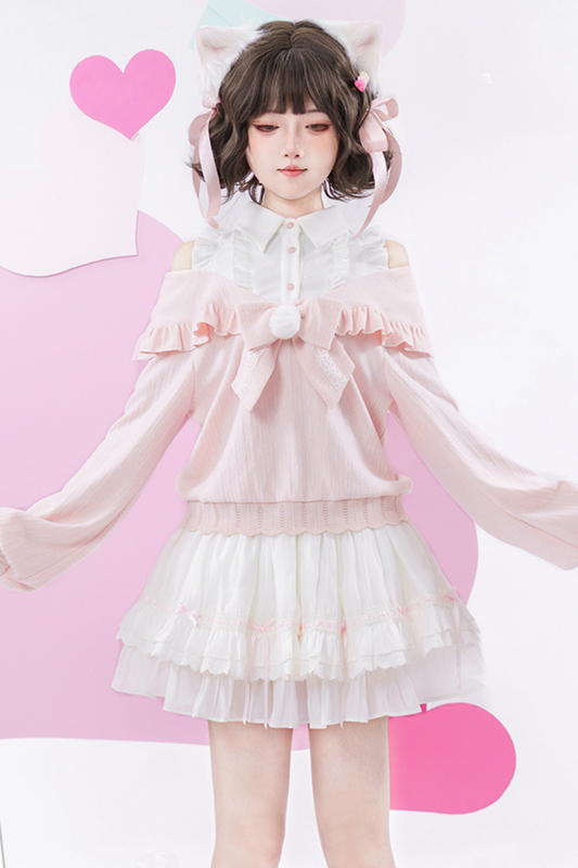 【12月8日予約締切】ブラックホワイトレースシアーショルダーニットトップス+ケーキスカート