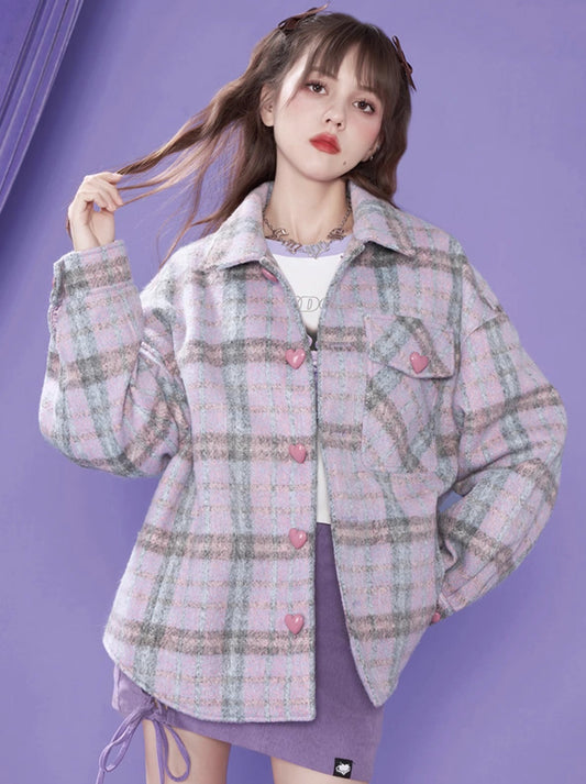 Rosa Diamond Check Lazy Style Mohair-Strickjacke mit V-Ausschnitt