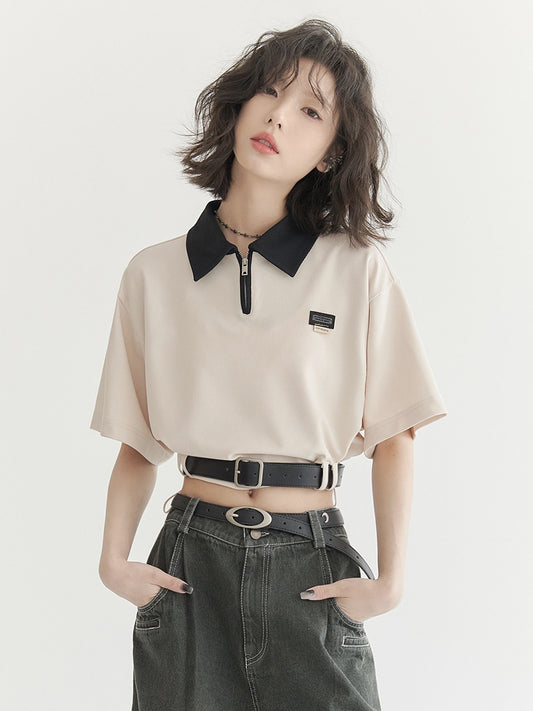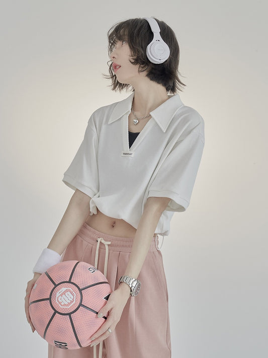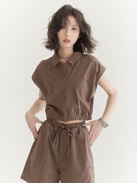 Polokragen ärmelloses kurzes T-Shirt lockeres Oberteil