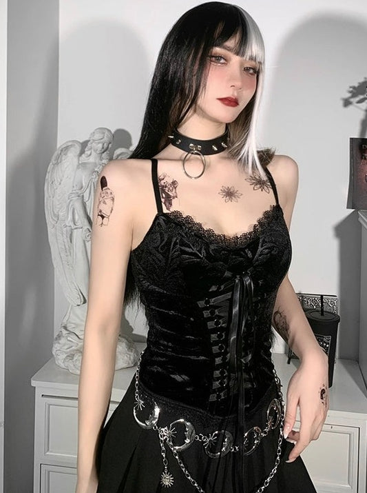 Dunkles schwarzes Sommer-Trägerhemd aus Spitze