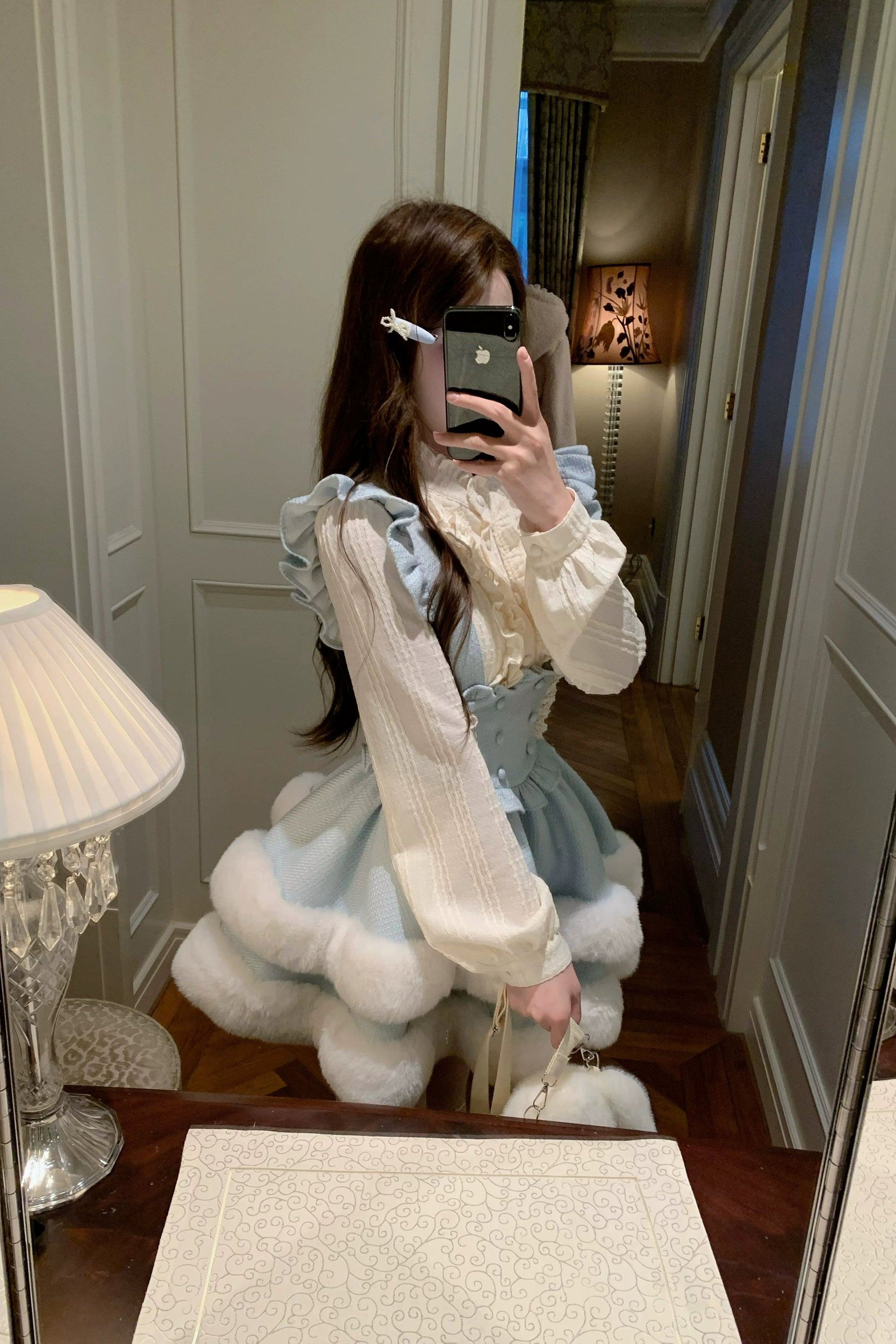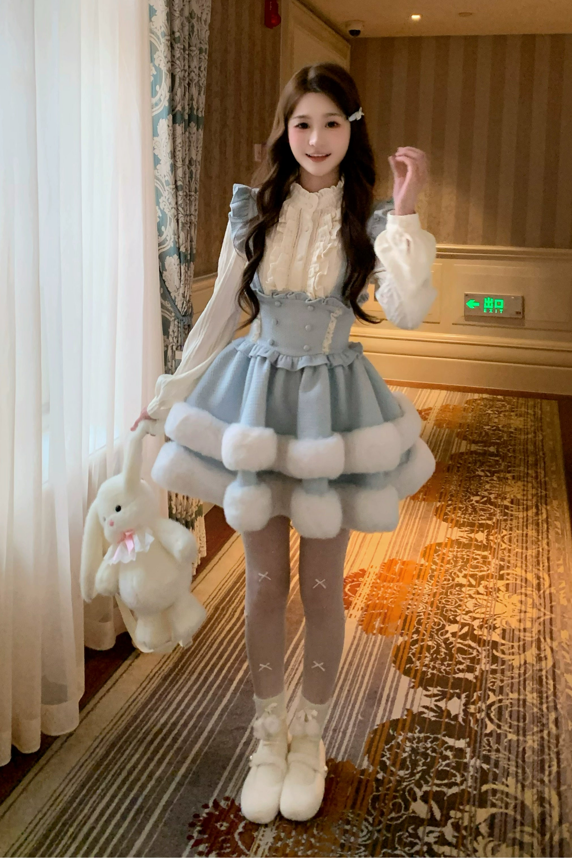 ❤ライトブルーファーカラーケープ+サスペンダースカート+シャツ❤