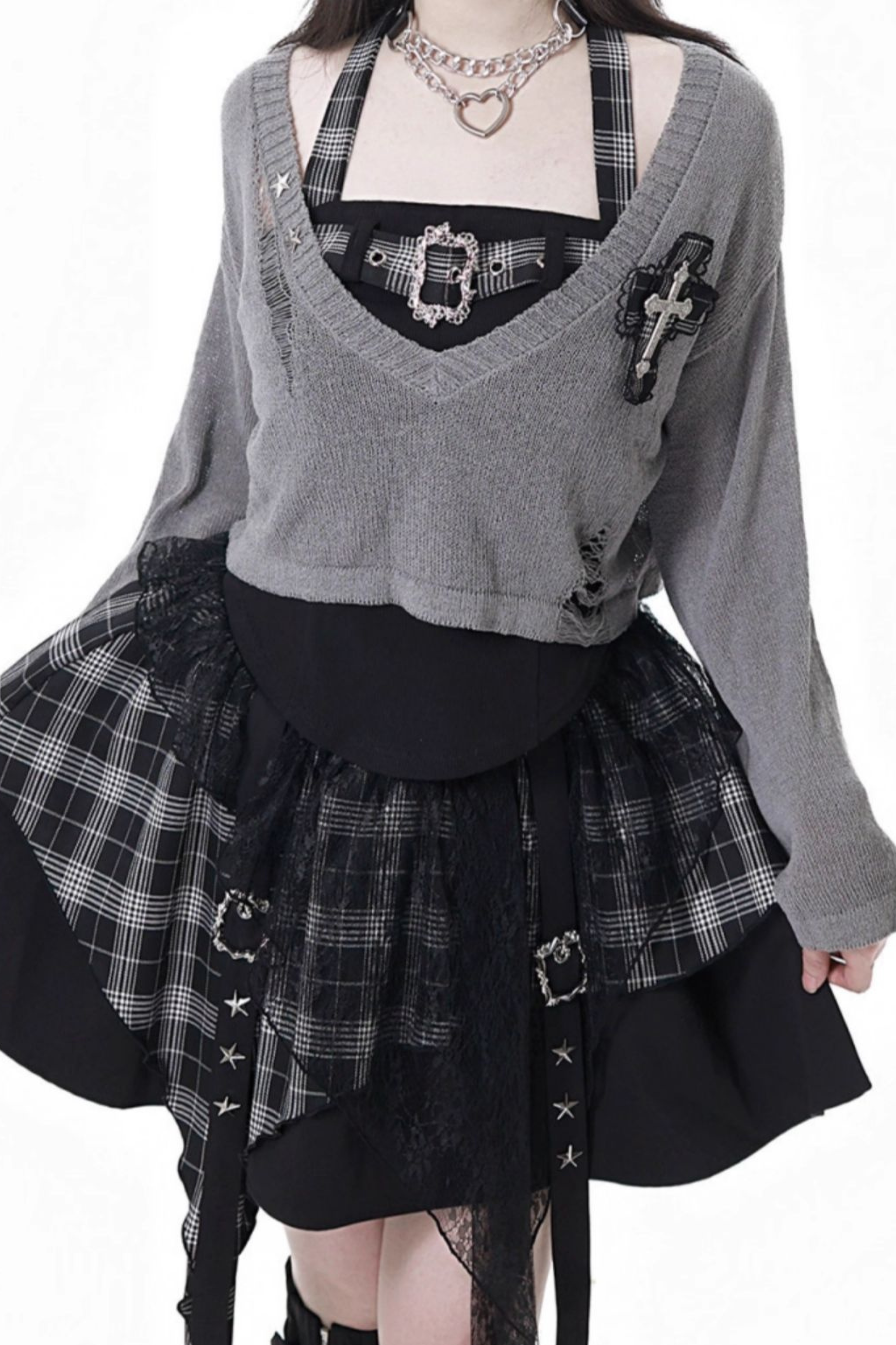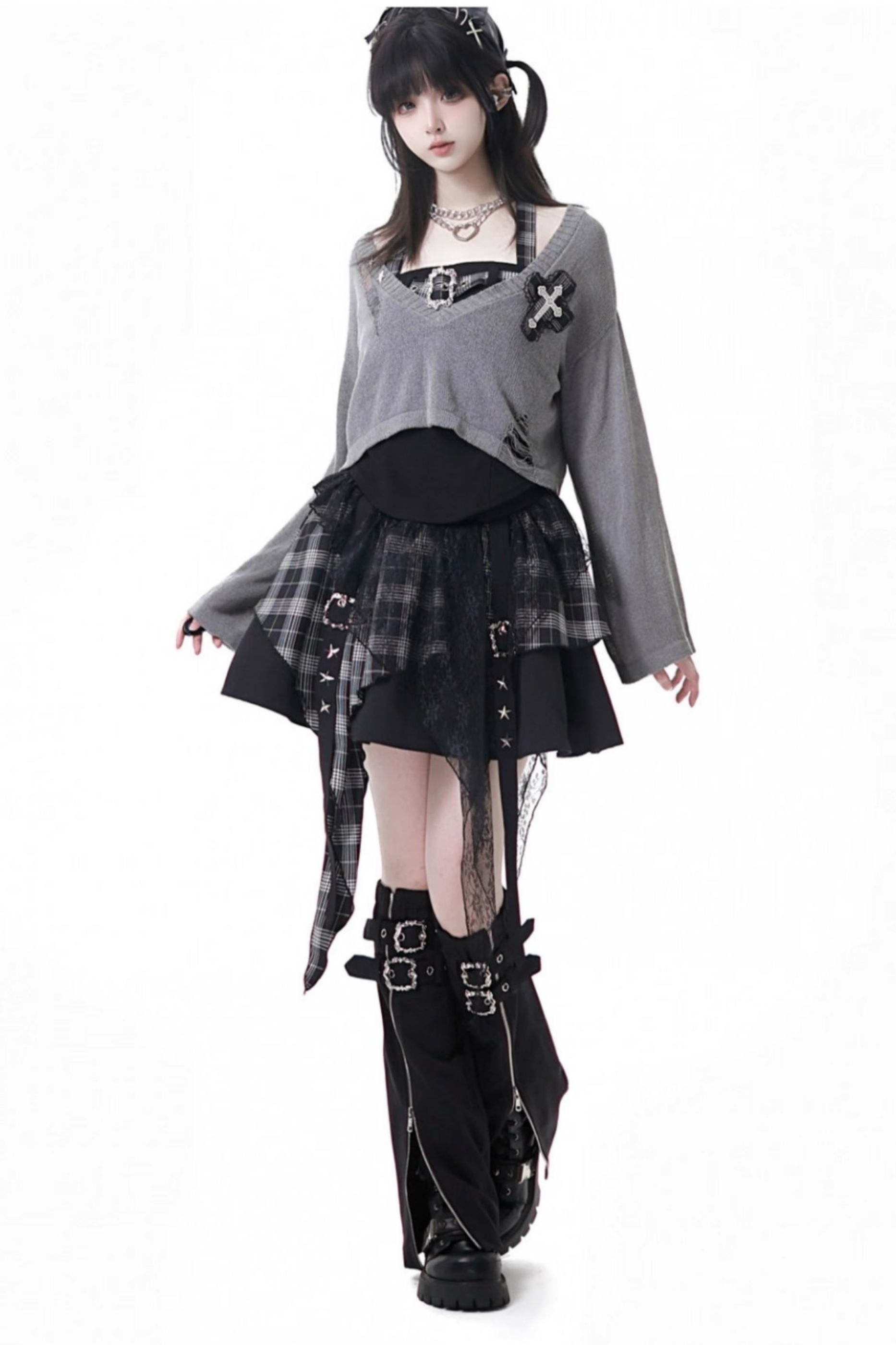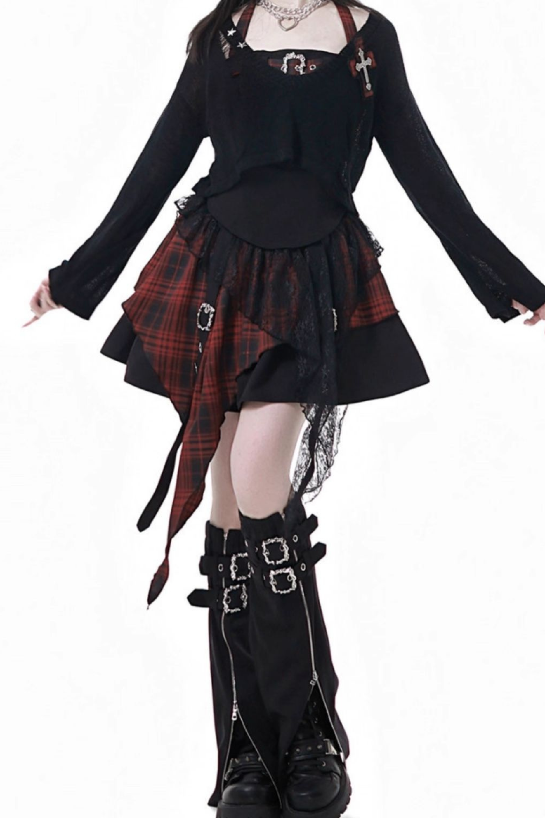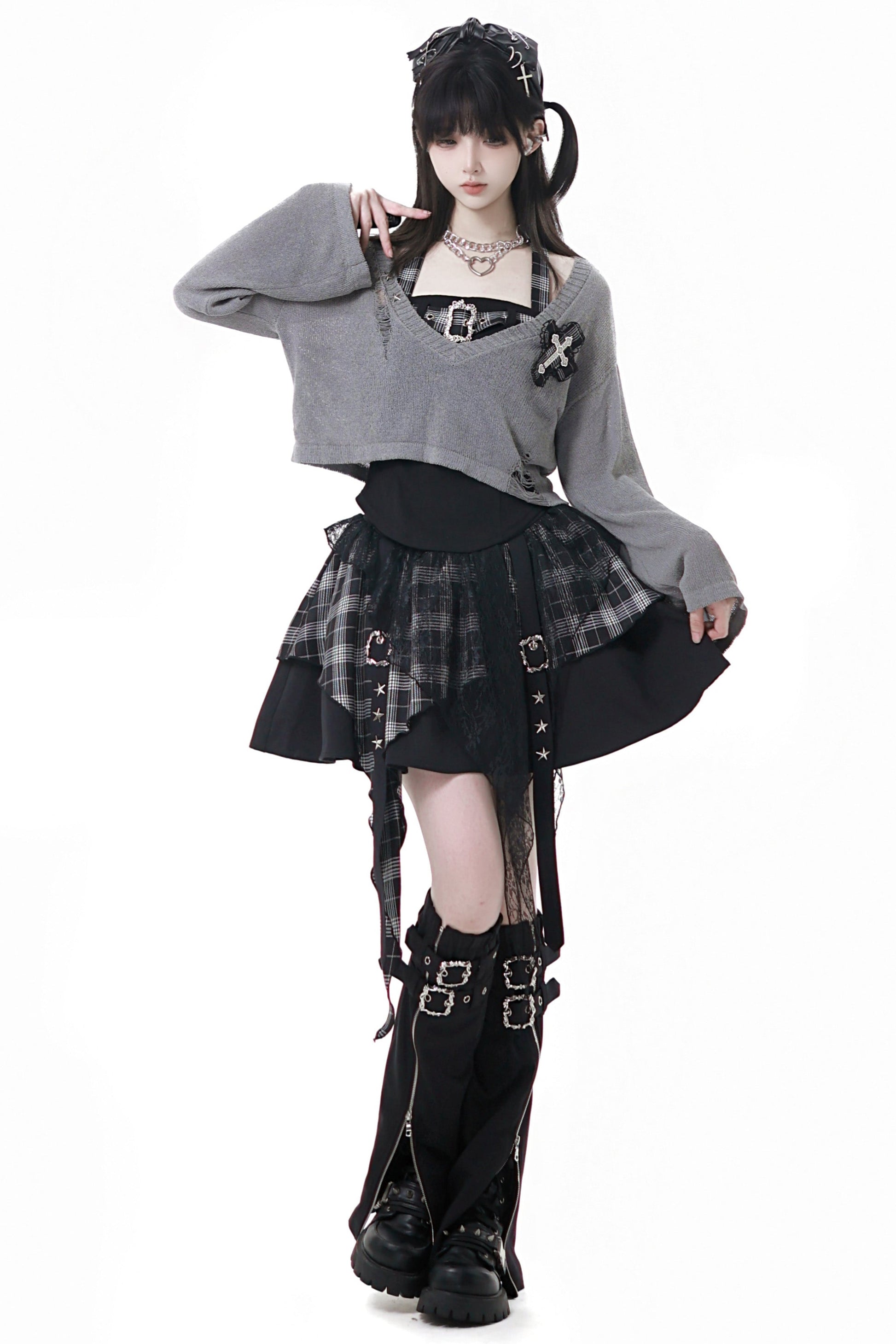 ホルターネックベスト+ルーズトップス+チェックスカート+レッグウォーマー
