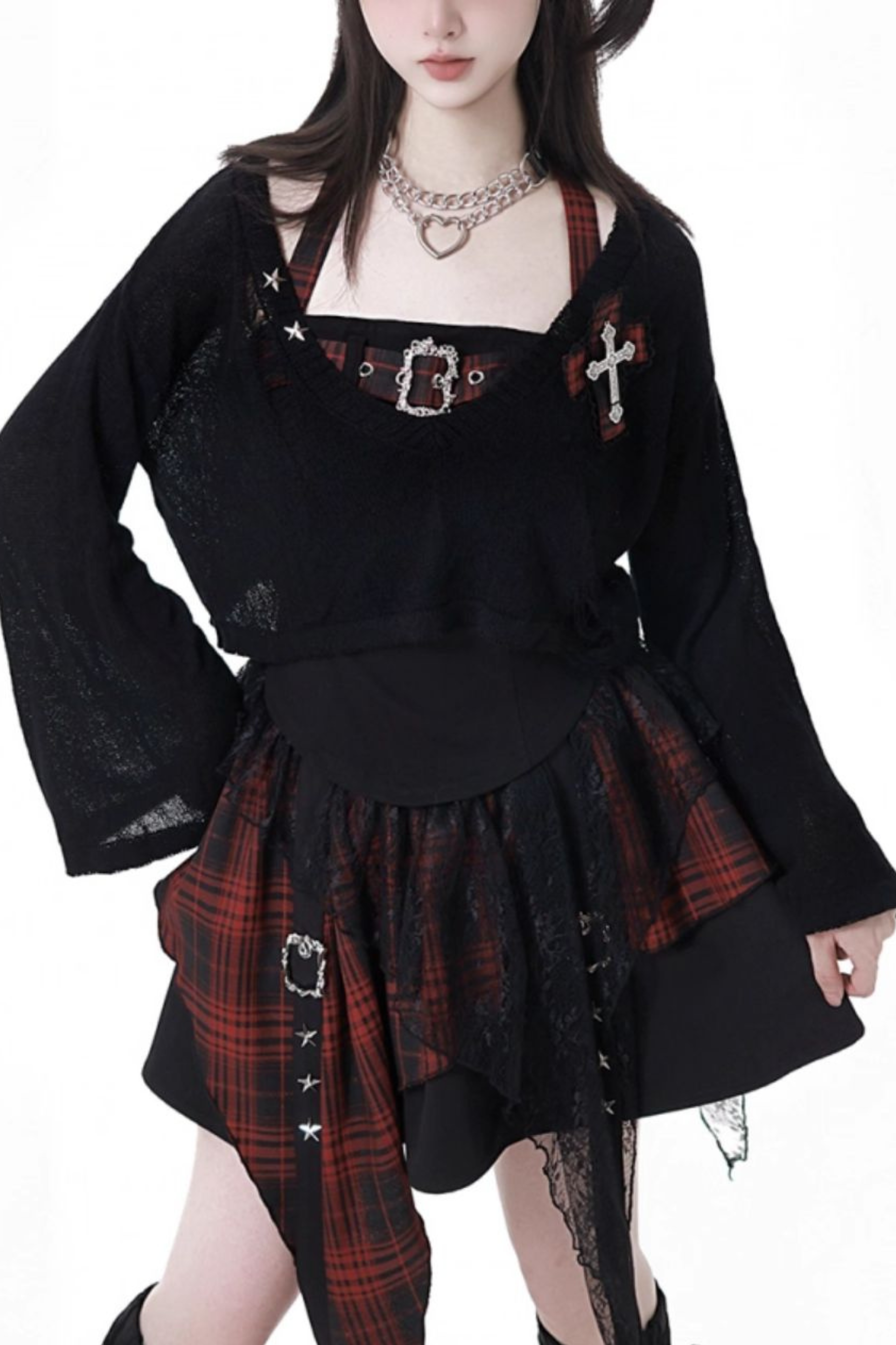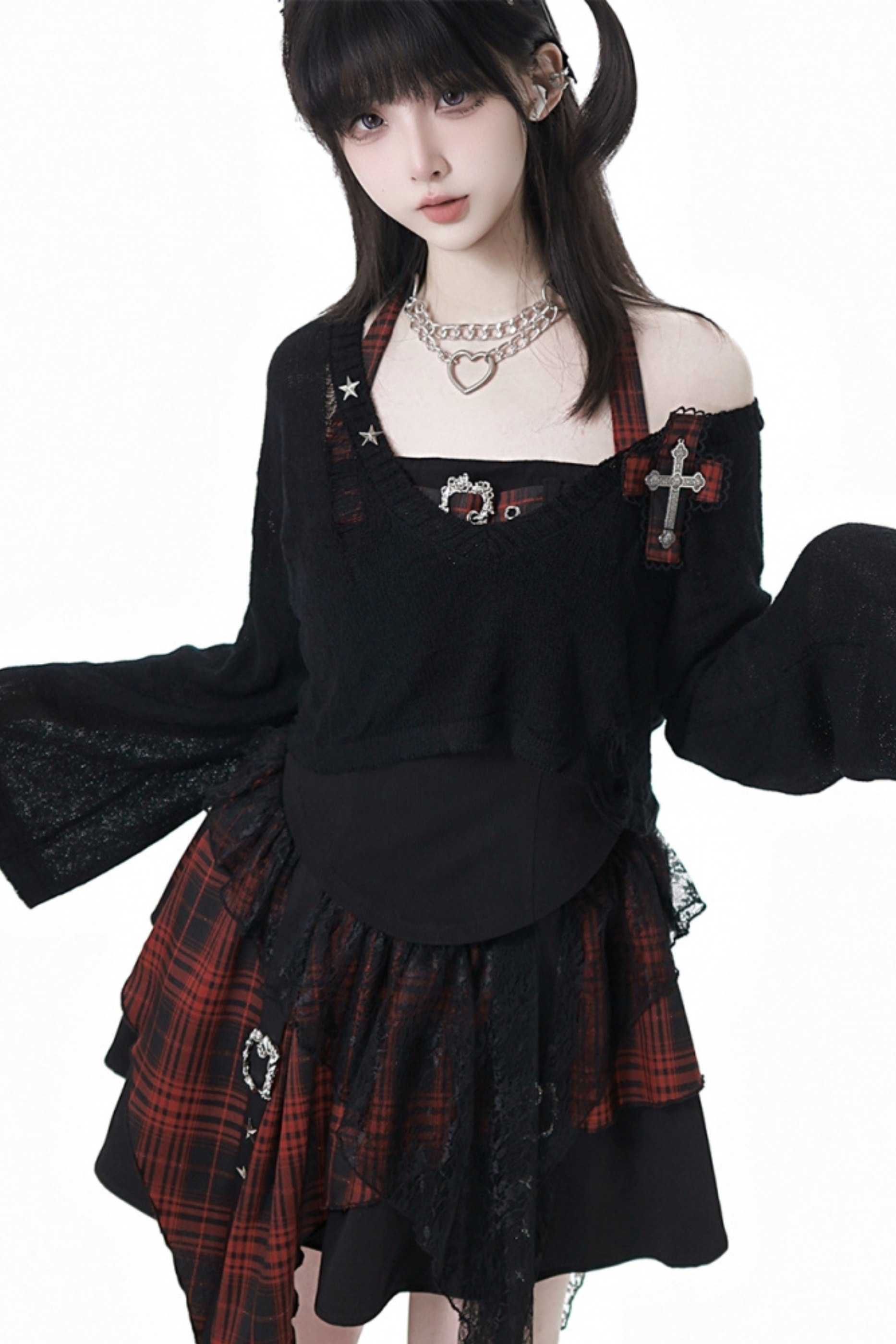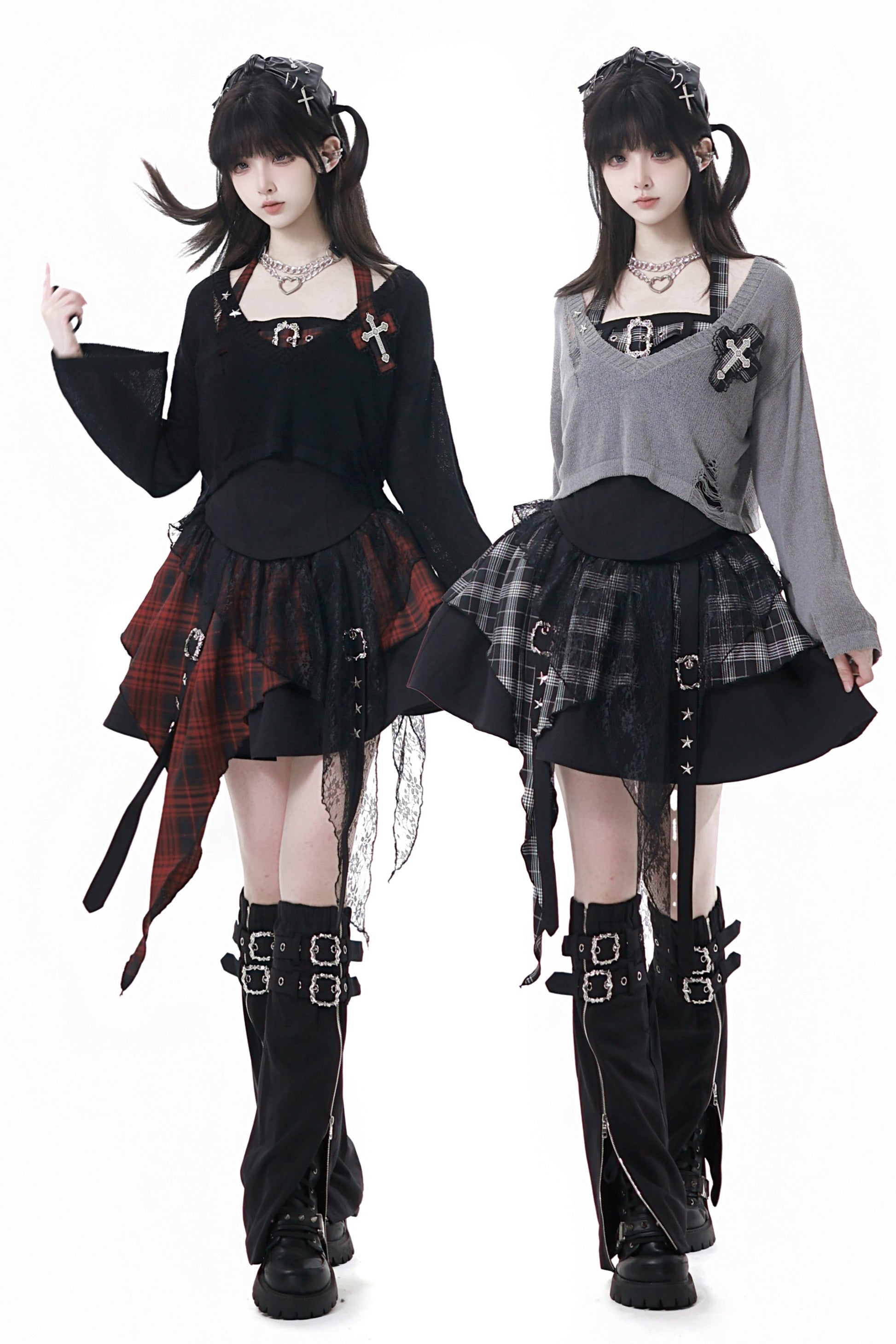 ホルターネックベスト+ルーズトップス+チェックスカート+レッグウォーマー