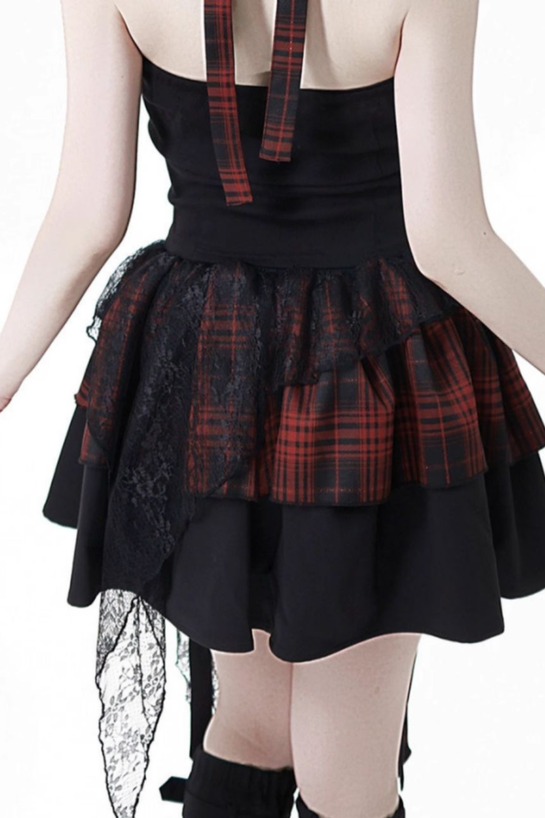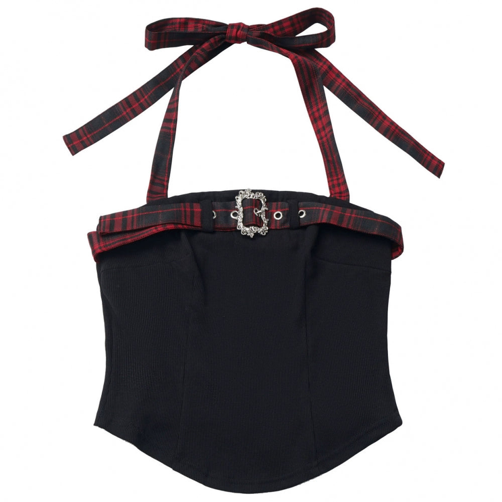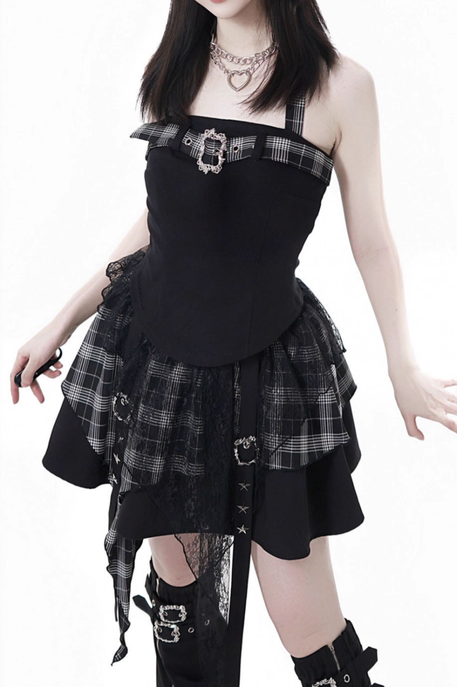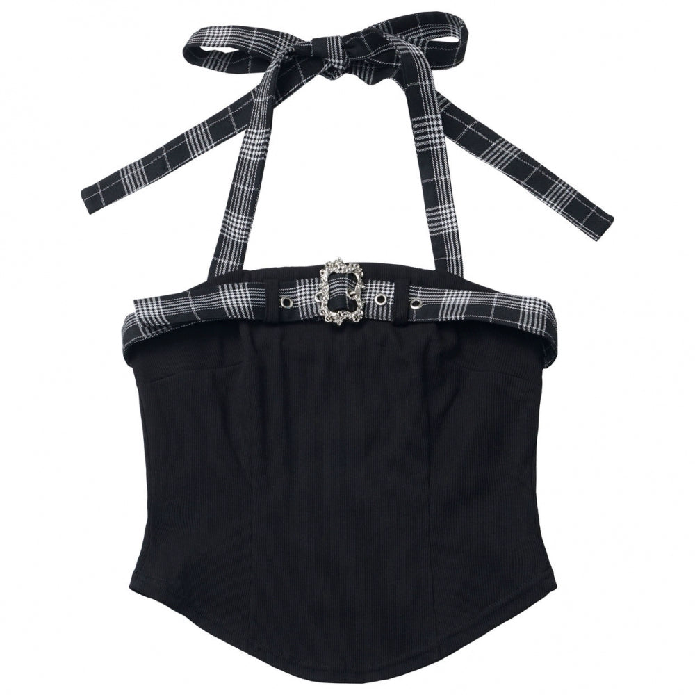 ホルターネックベスト+ルーズトップス+チェックスカート+レッグウォーマー