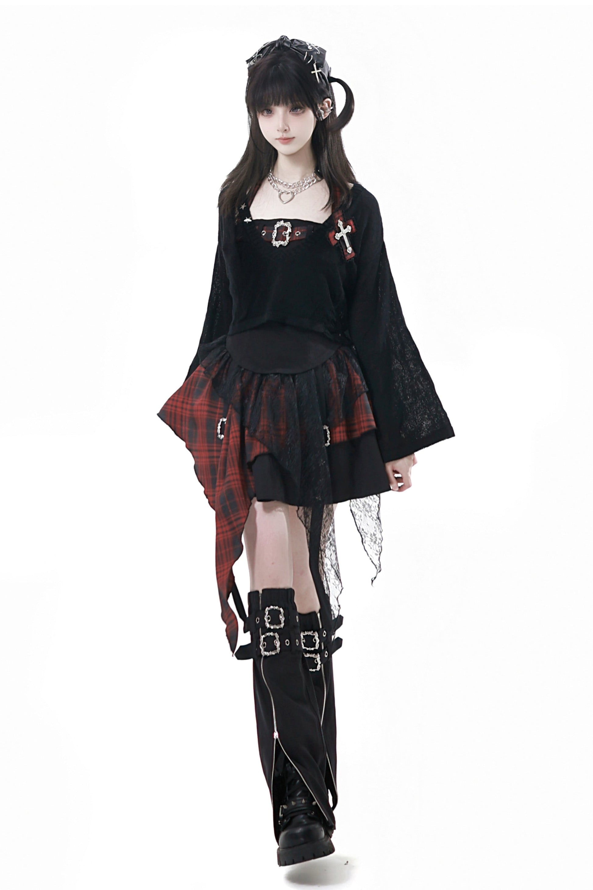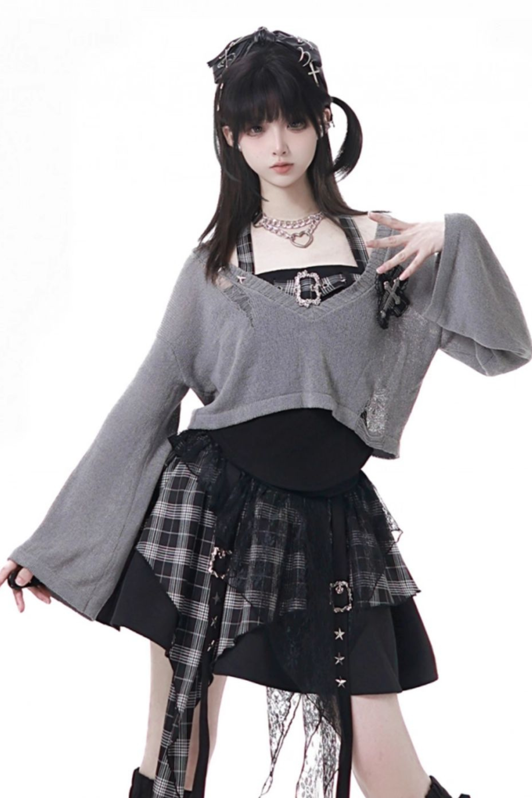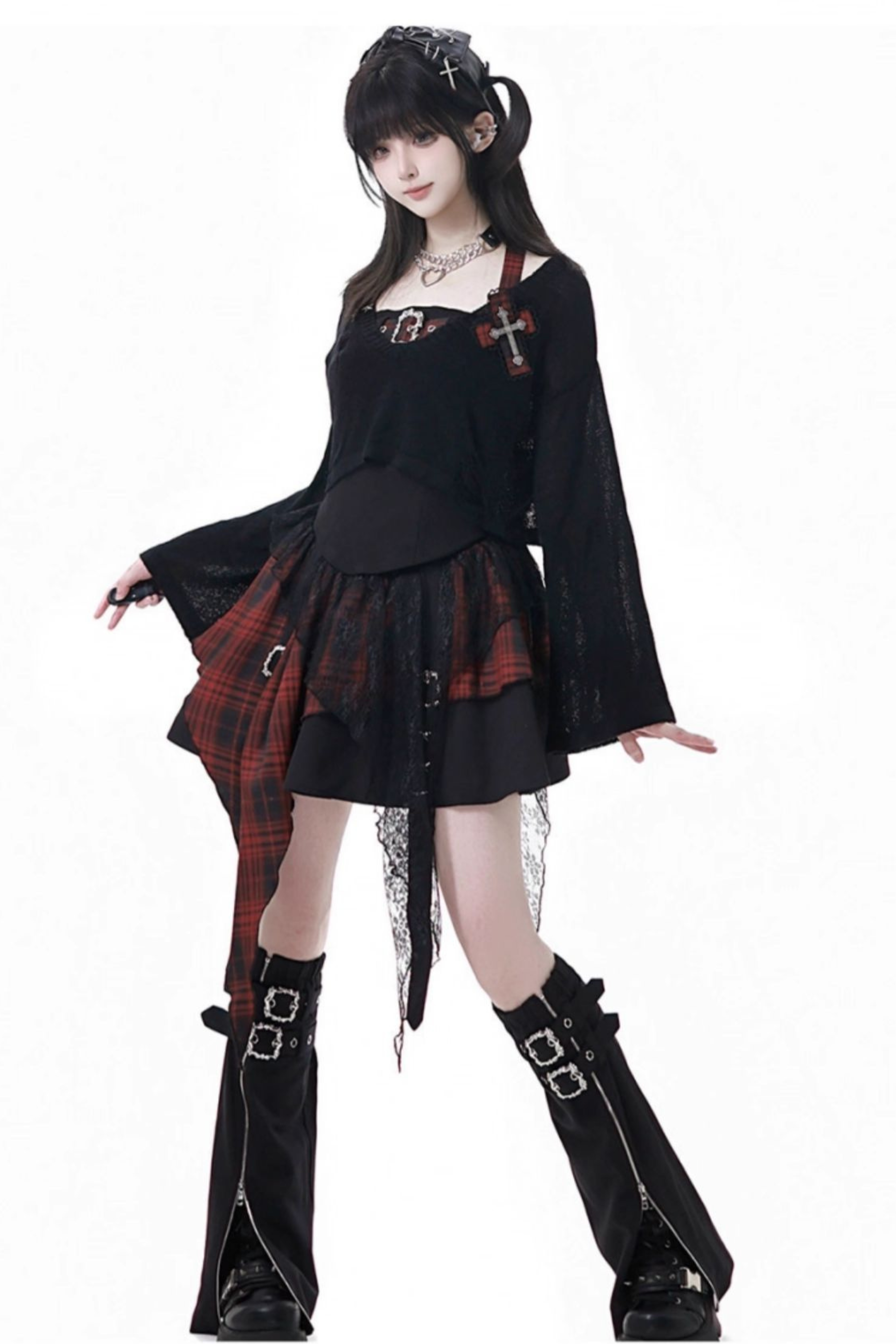 ❤ ホルターネックベスト+ルーズトップス+チェックスカート+レッグウォーマー❤