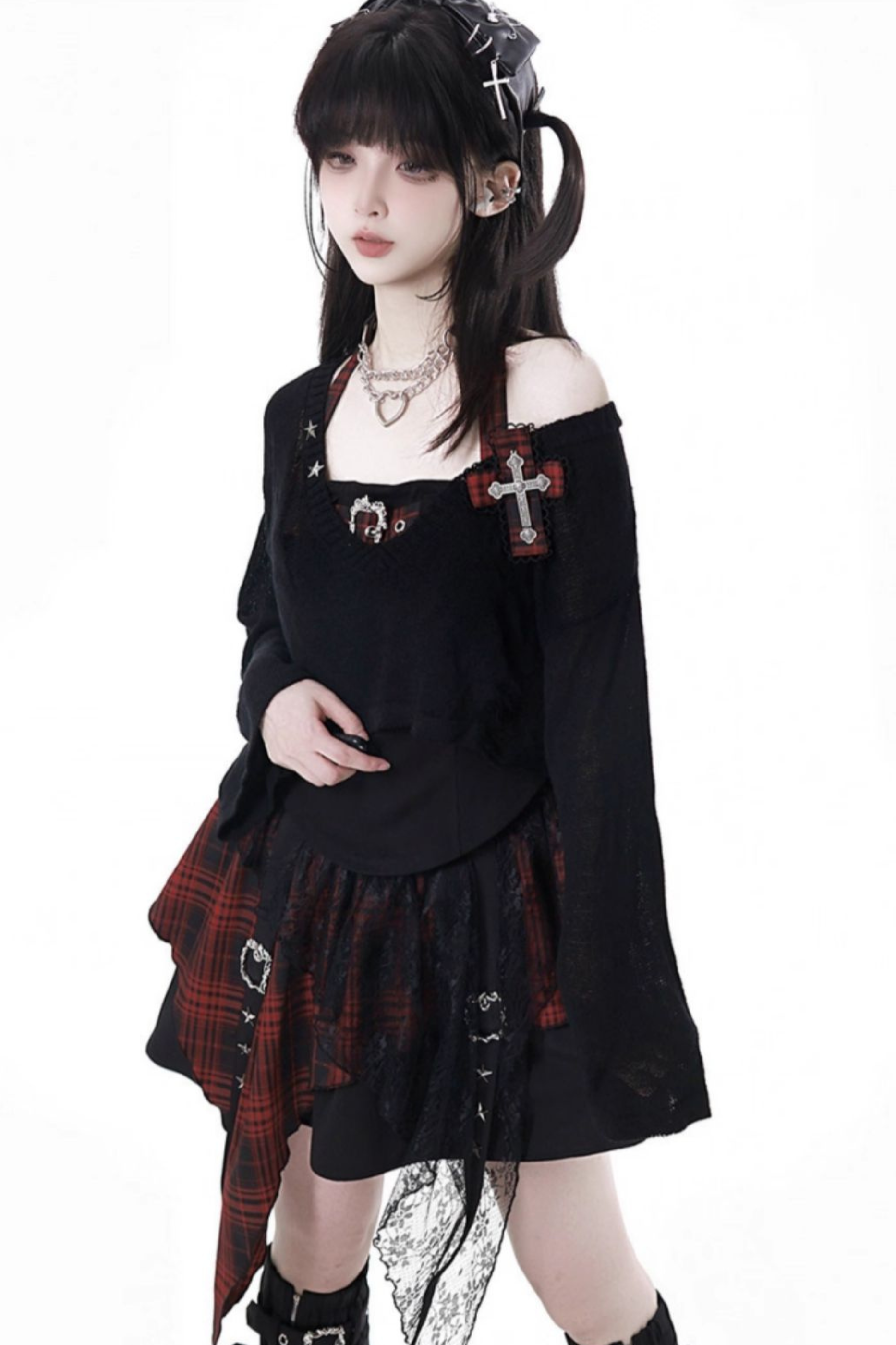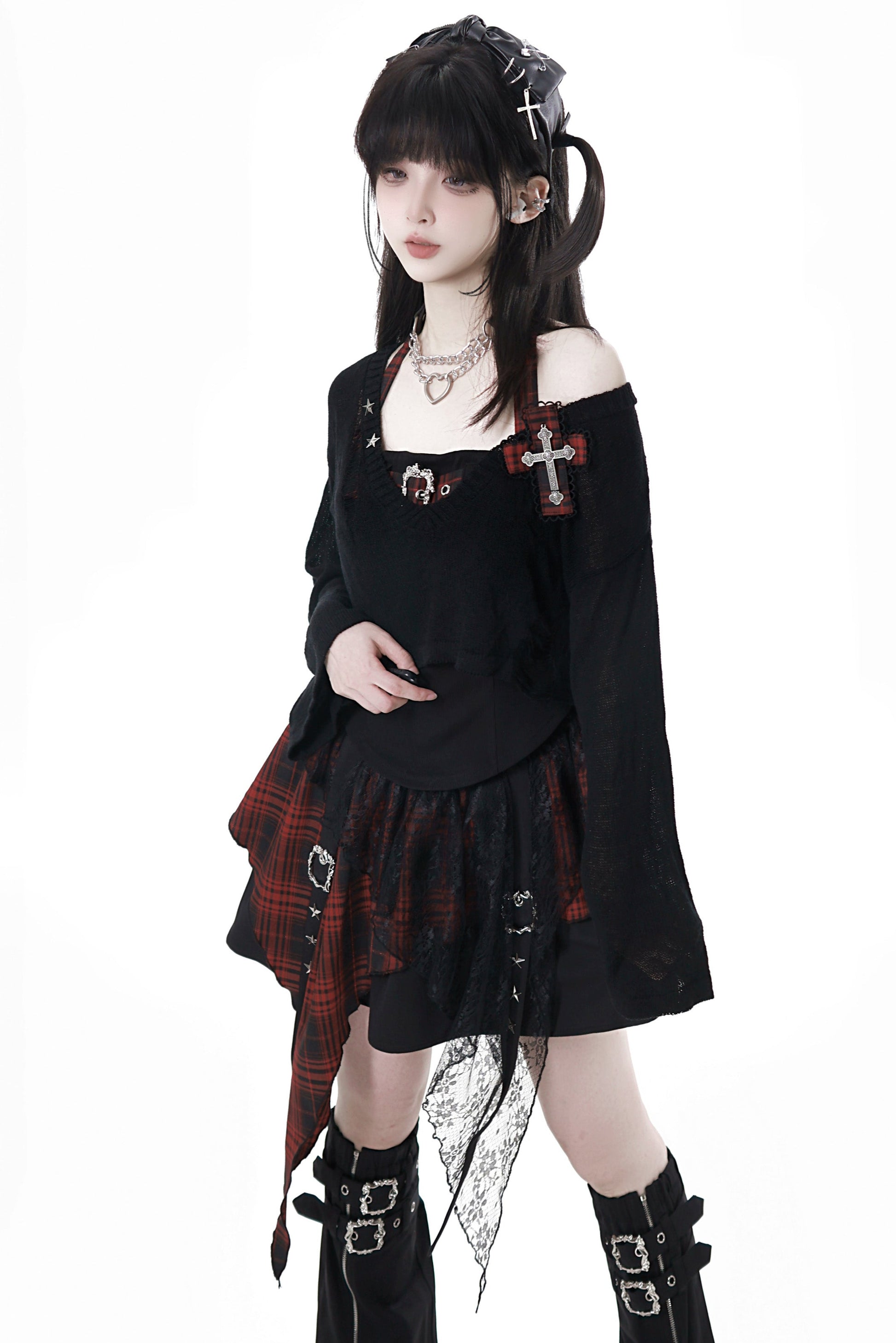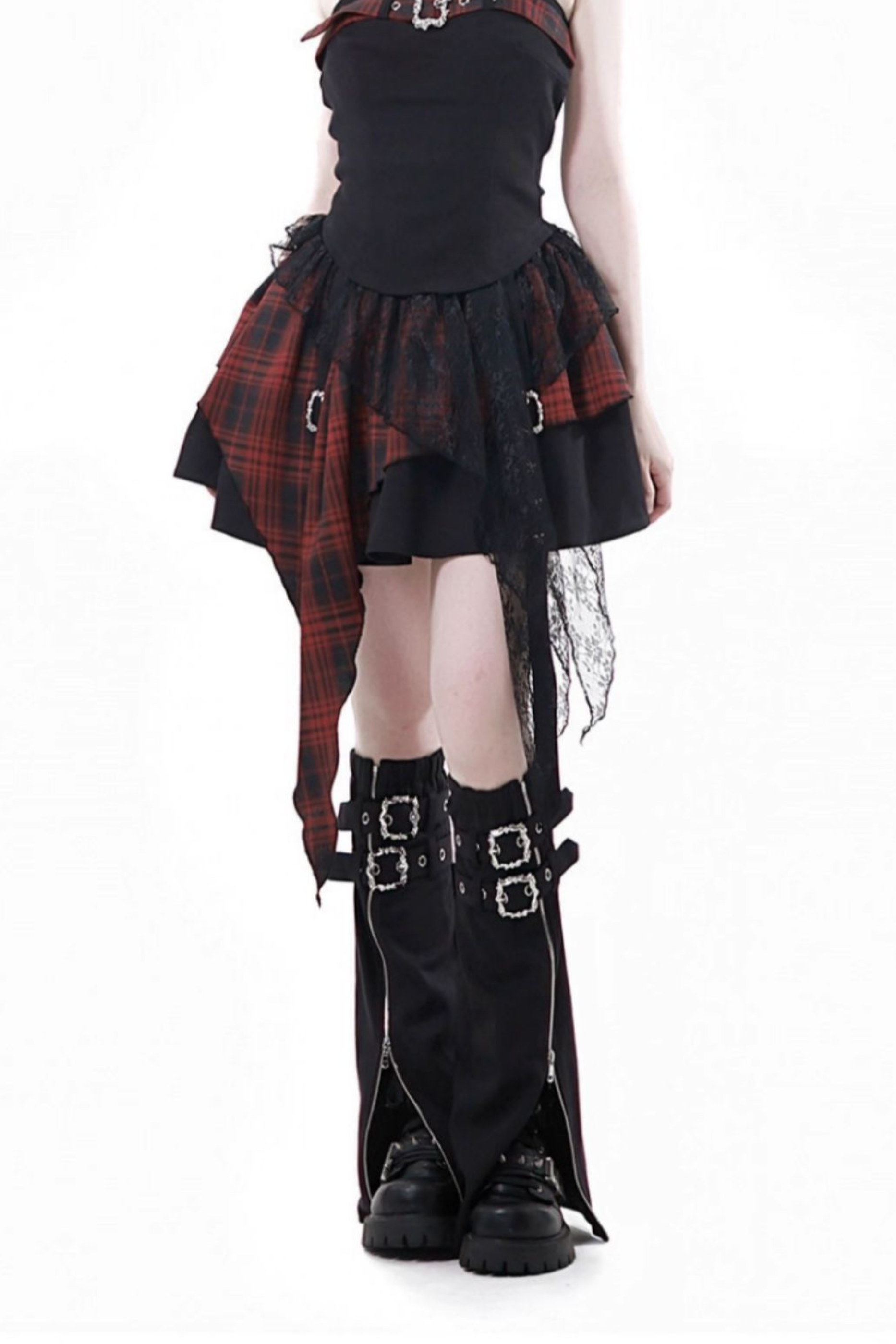 ❤ ホルターネックベスト+ルーズトップス+チェックスカート+レッグウォーマー❤
