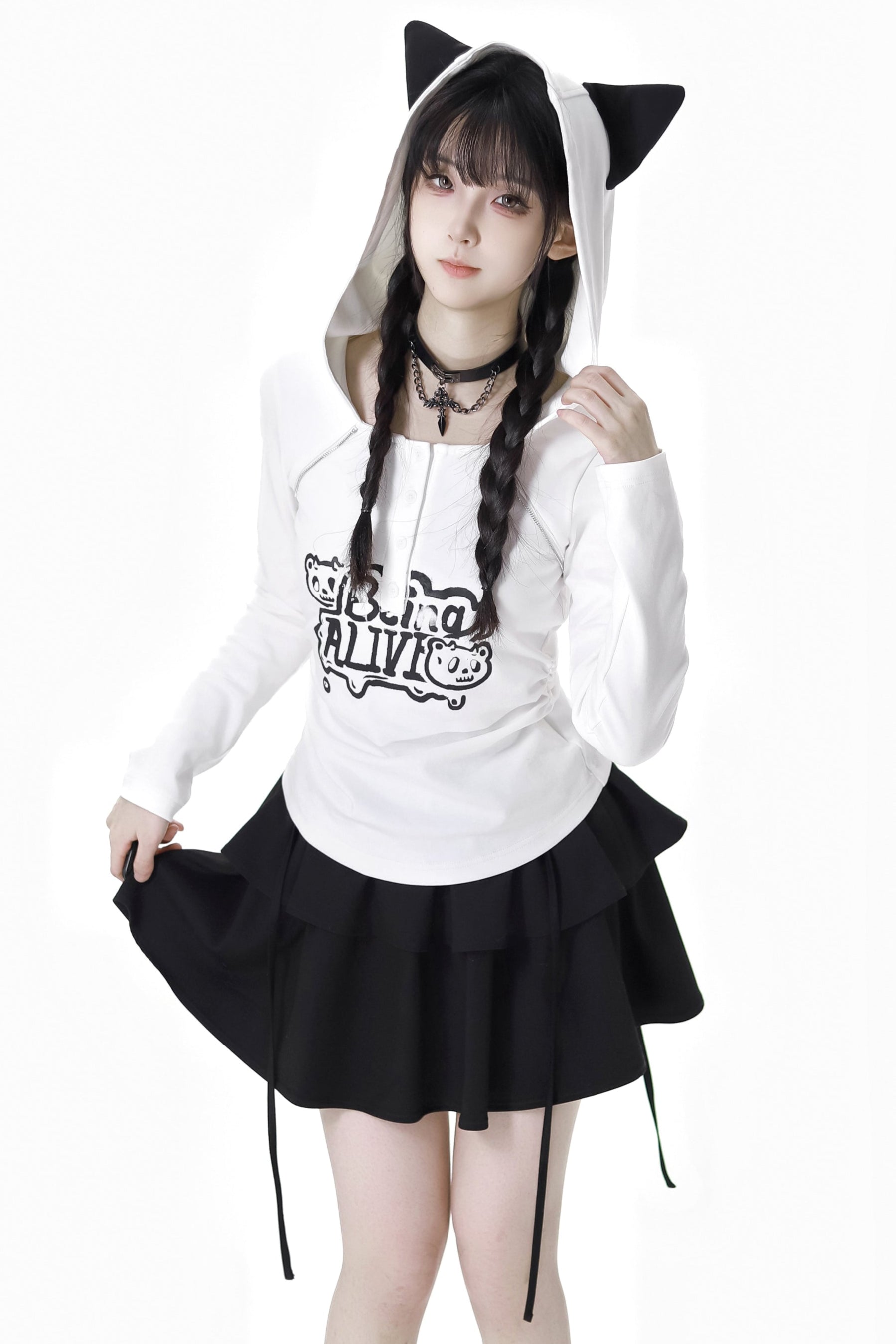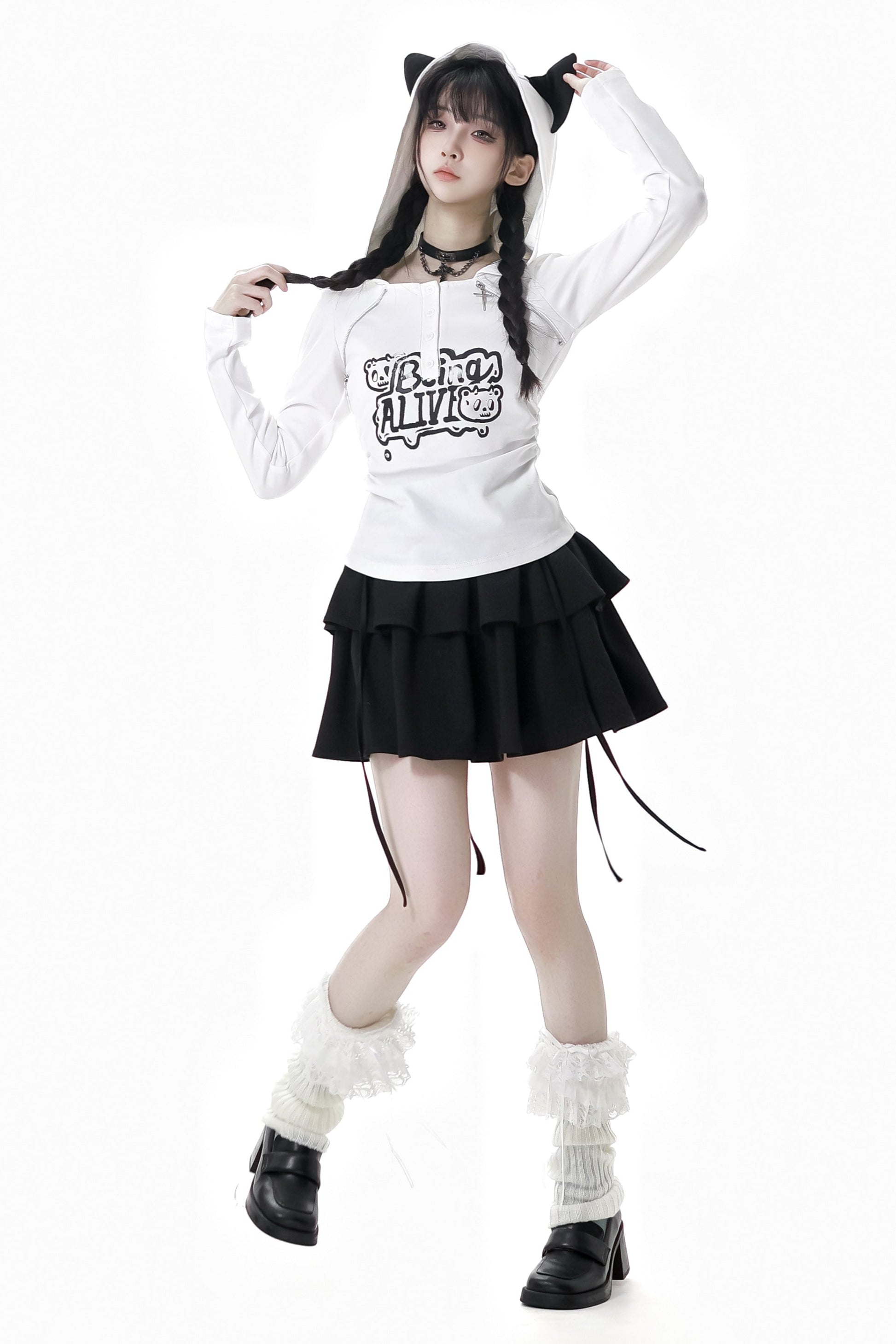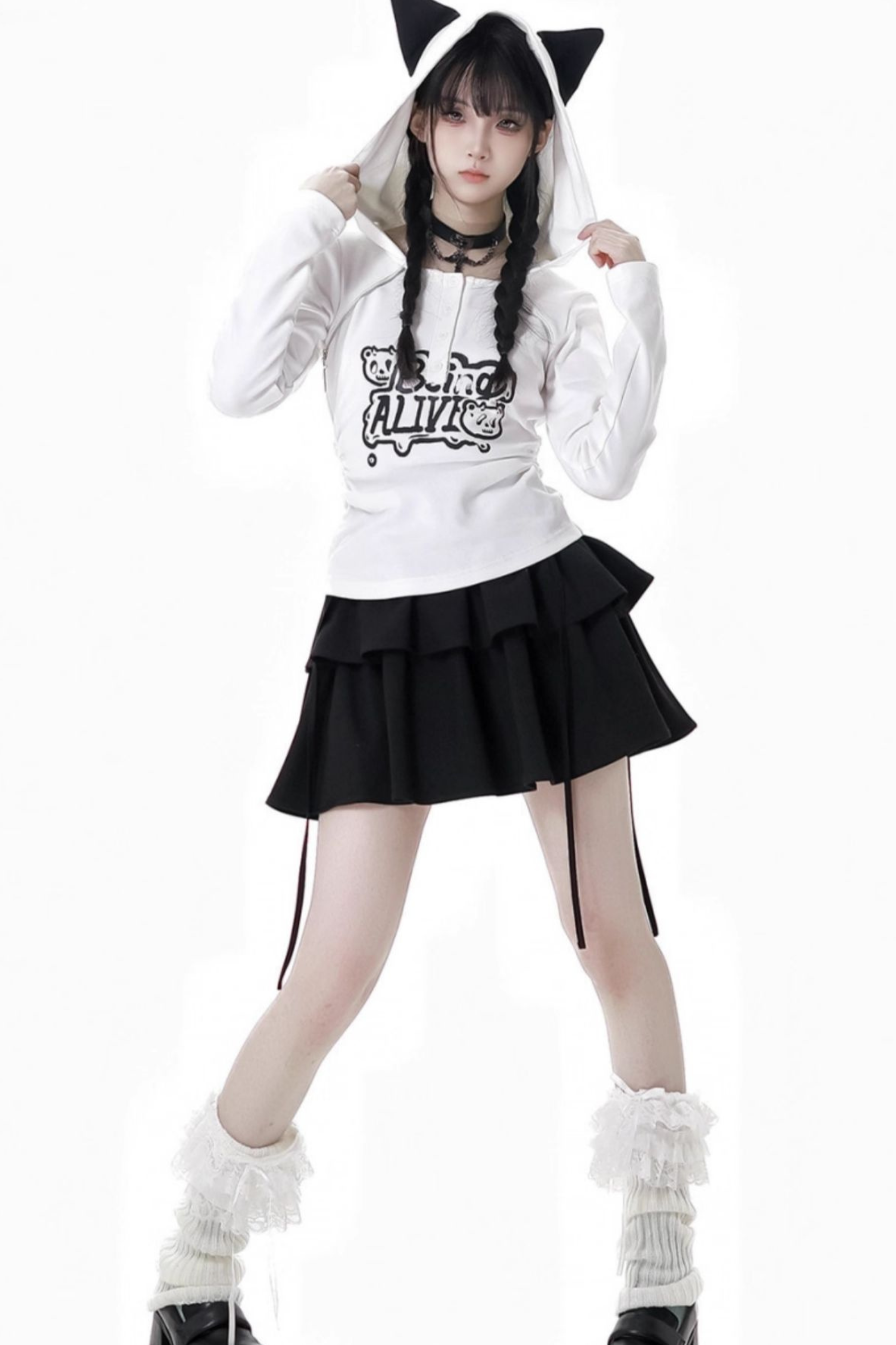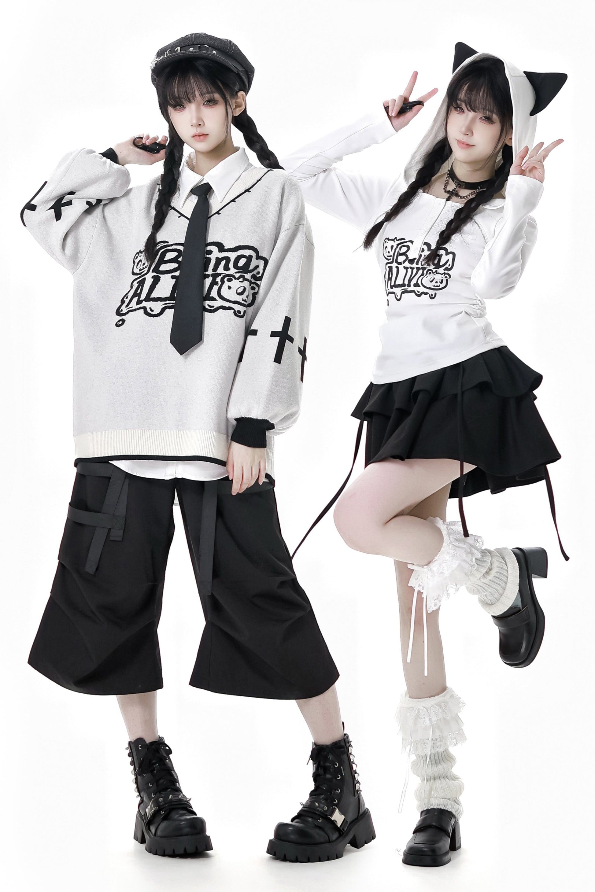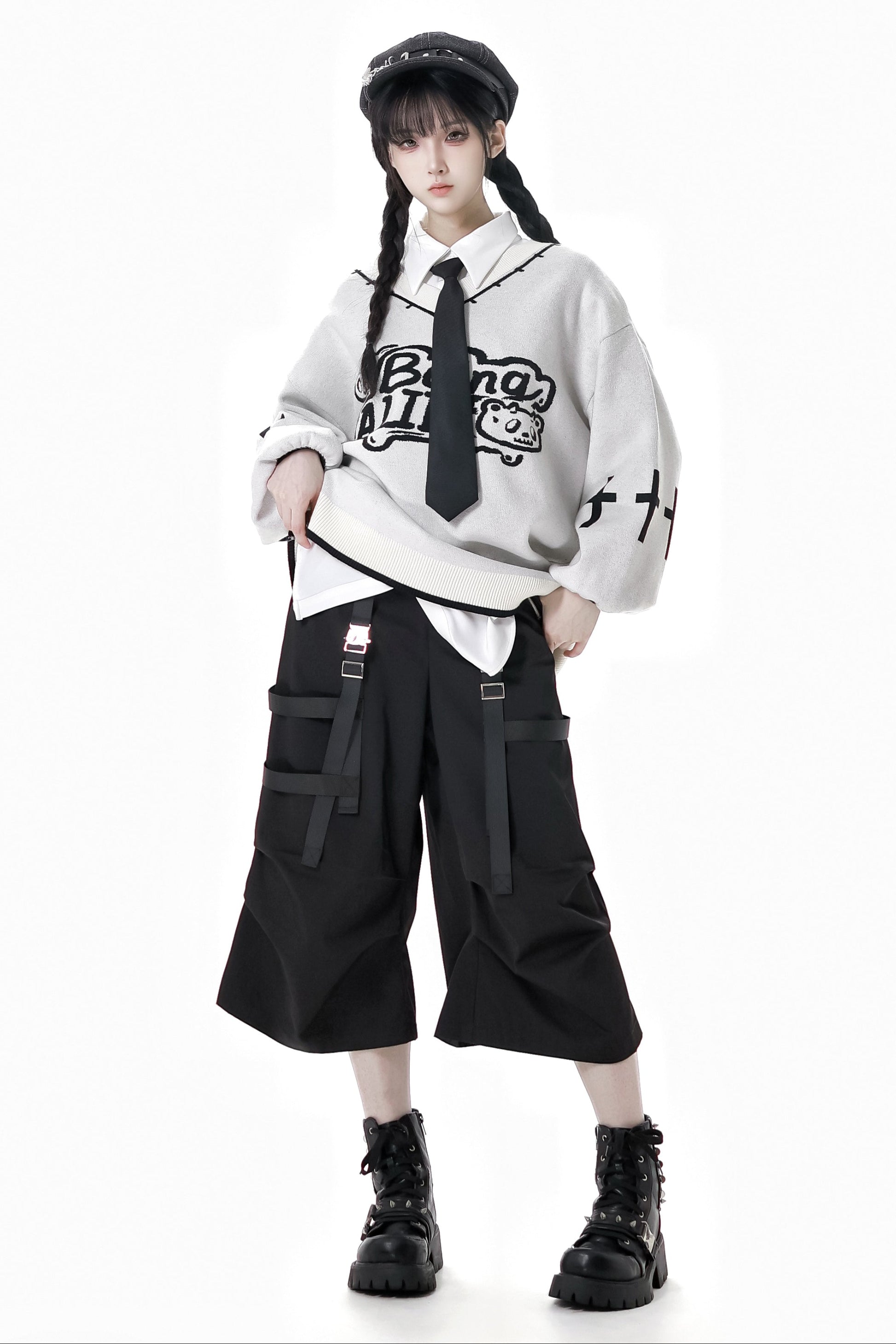 猫耳フードトップス+ルーズニットセーター+カーゴパンツ+ストラップスカート