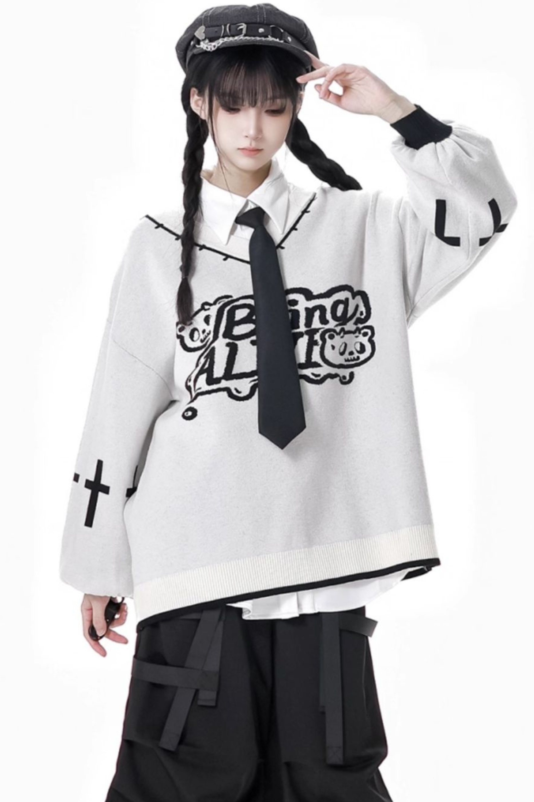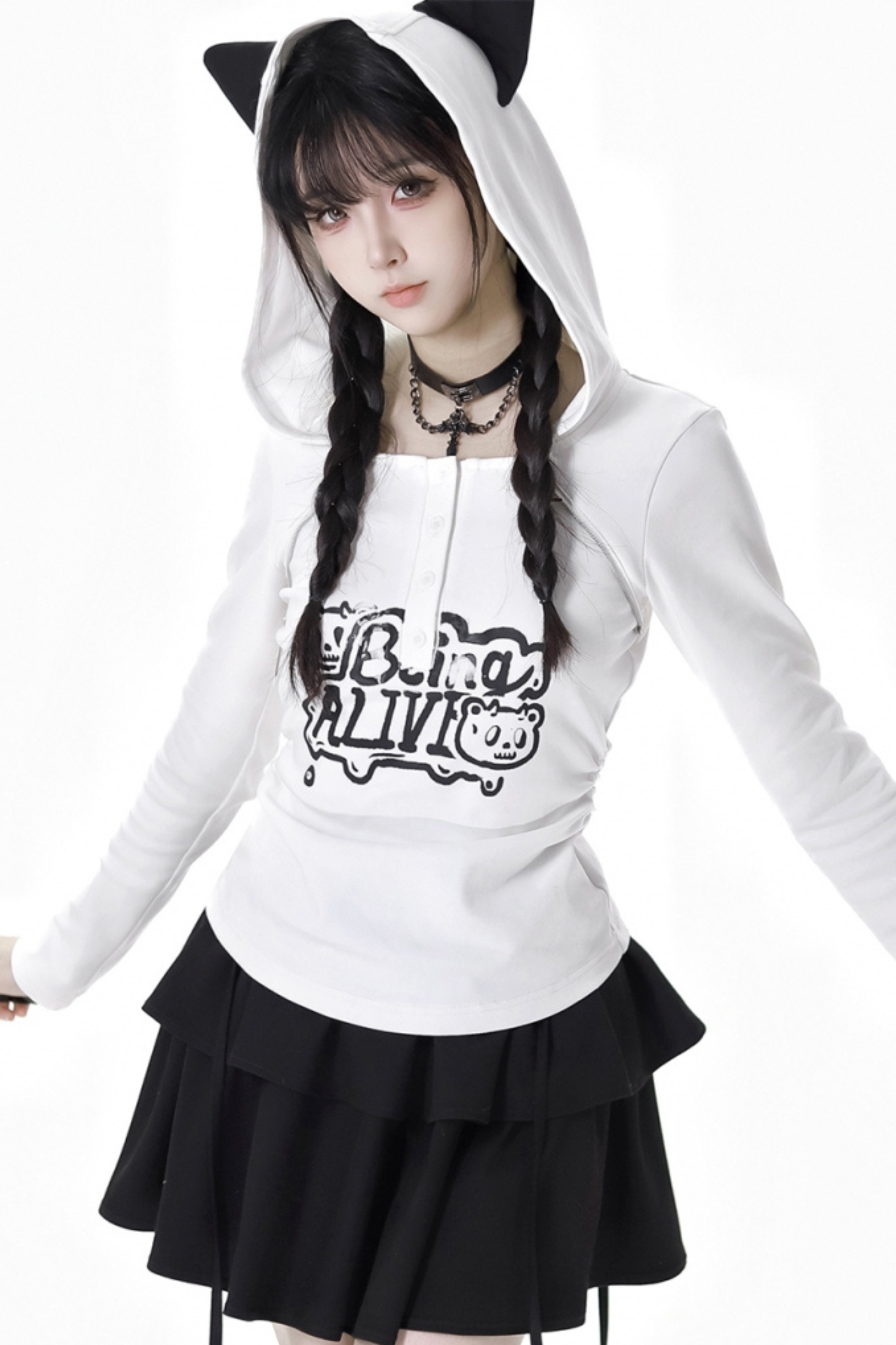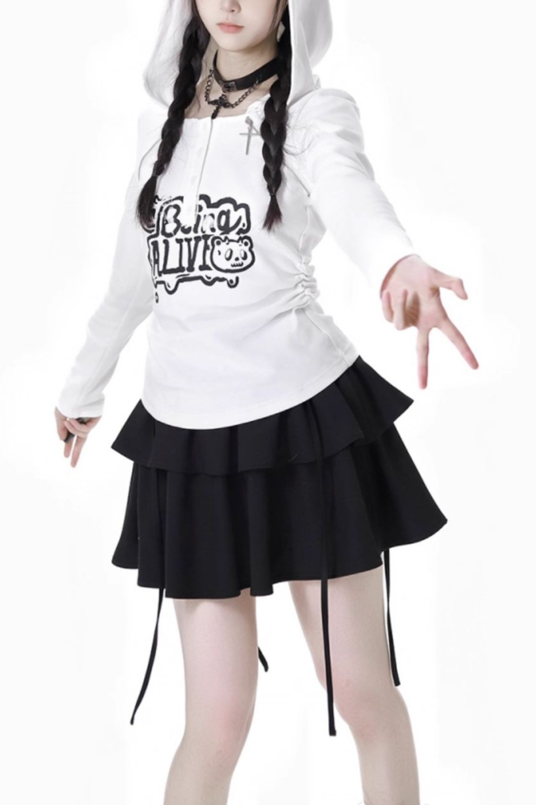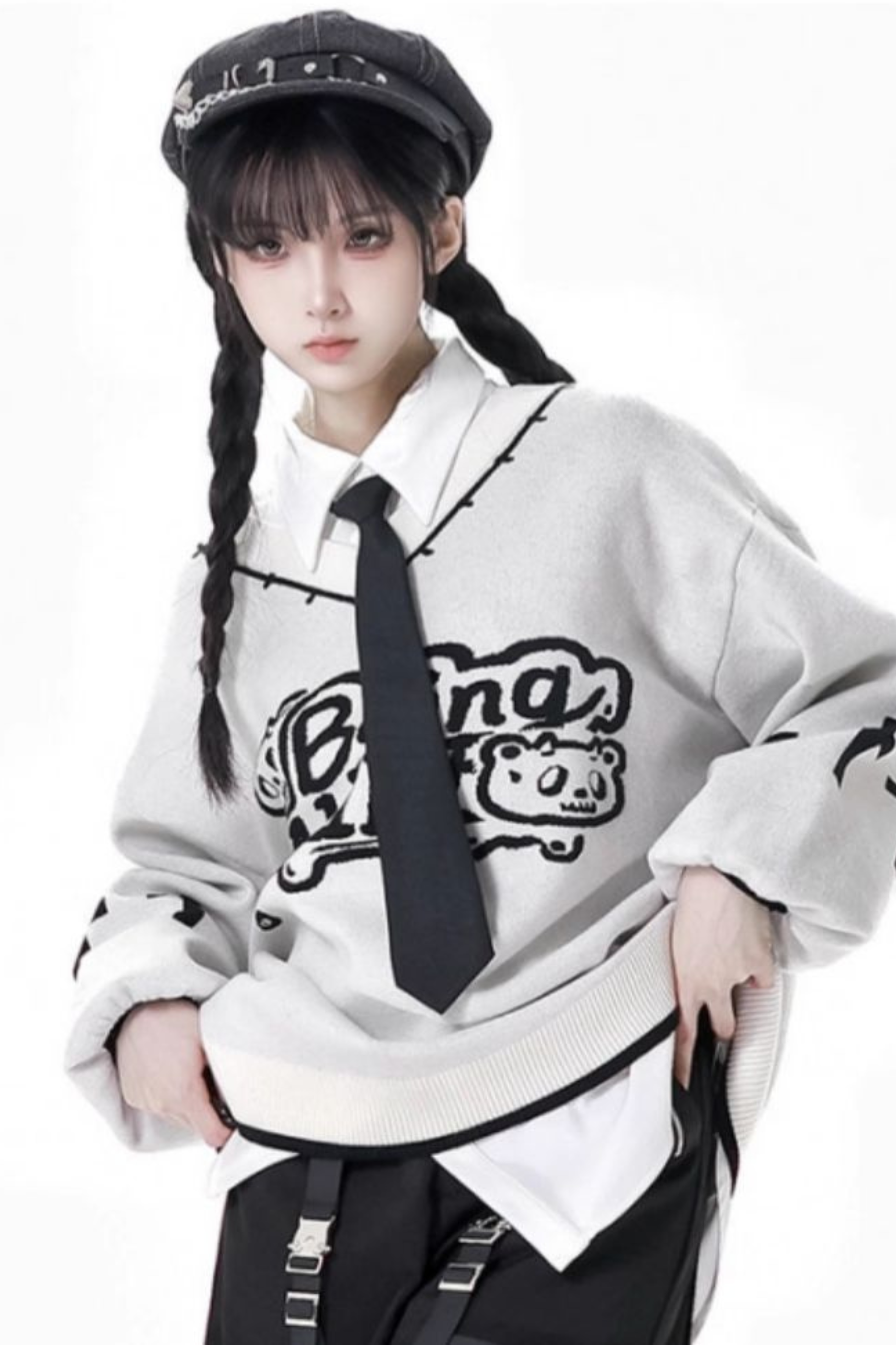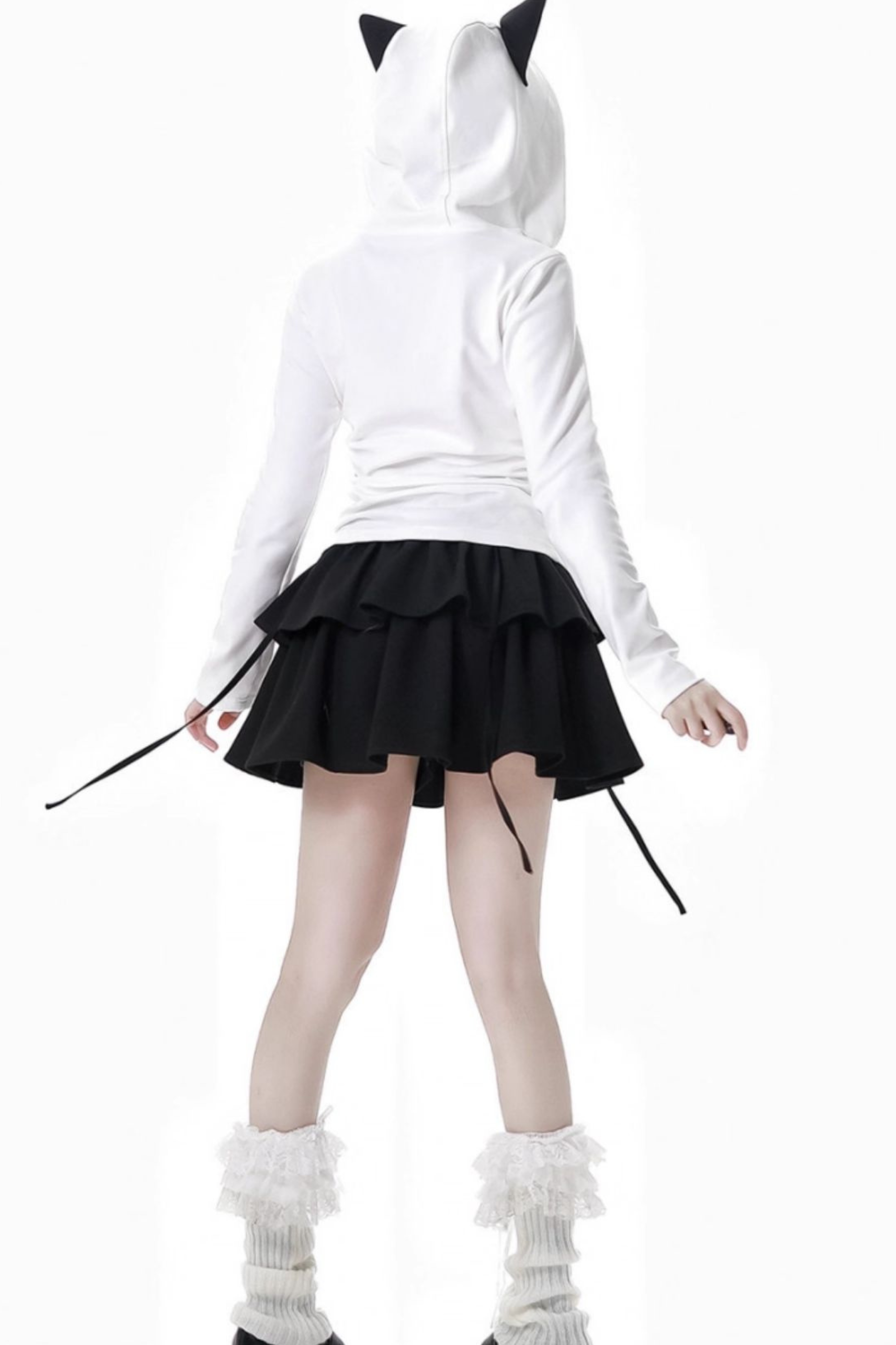 猫耳フードトップス+ルーズニットセーター+カーゴパンツ+ストラップスカート