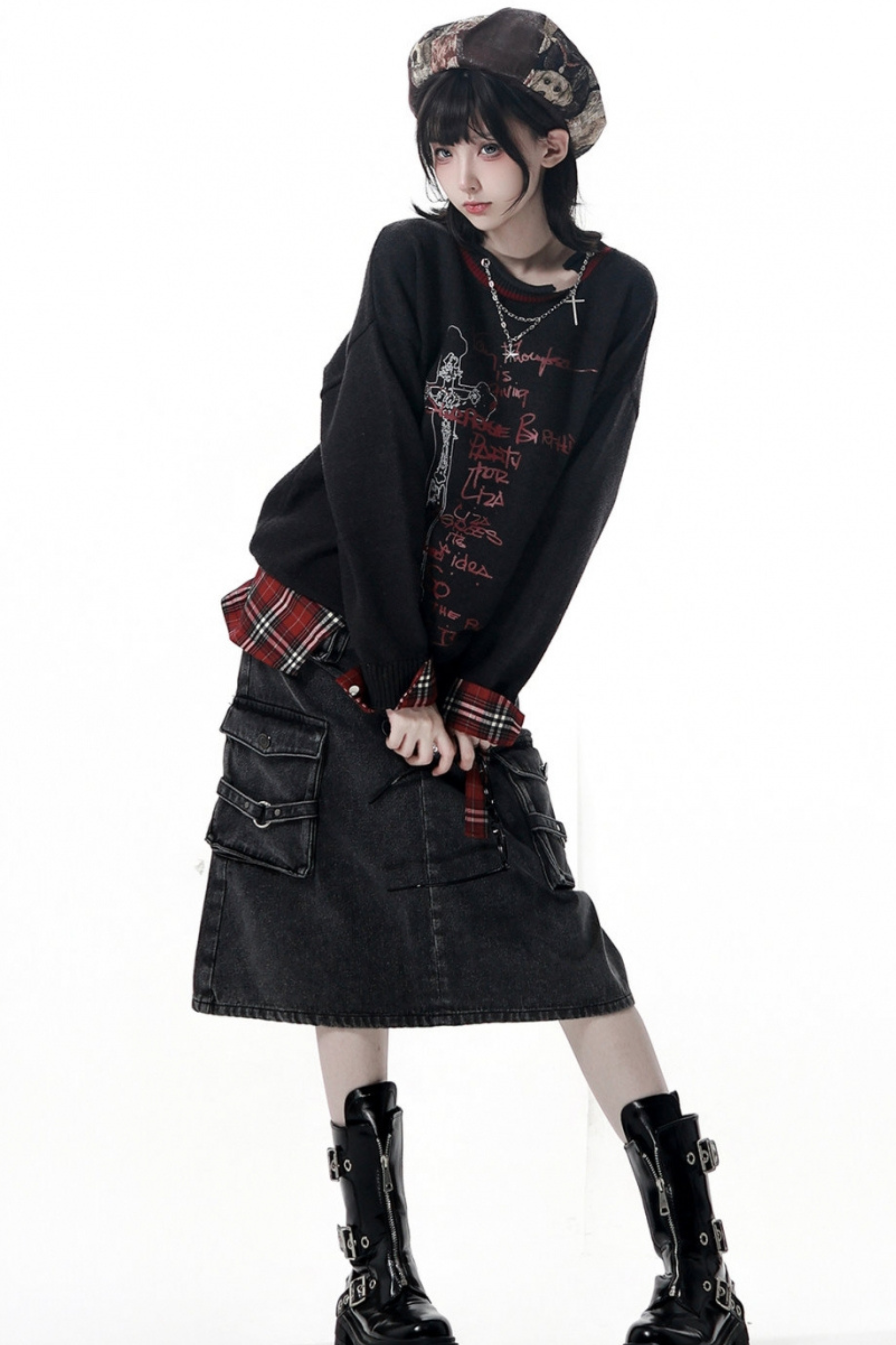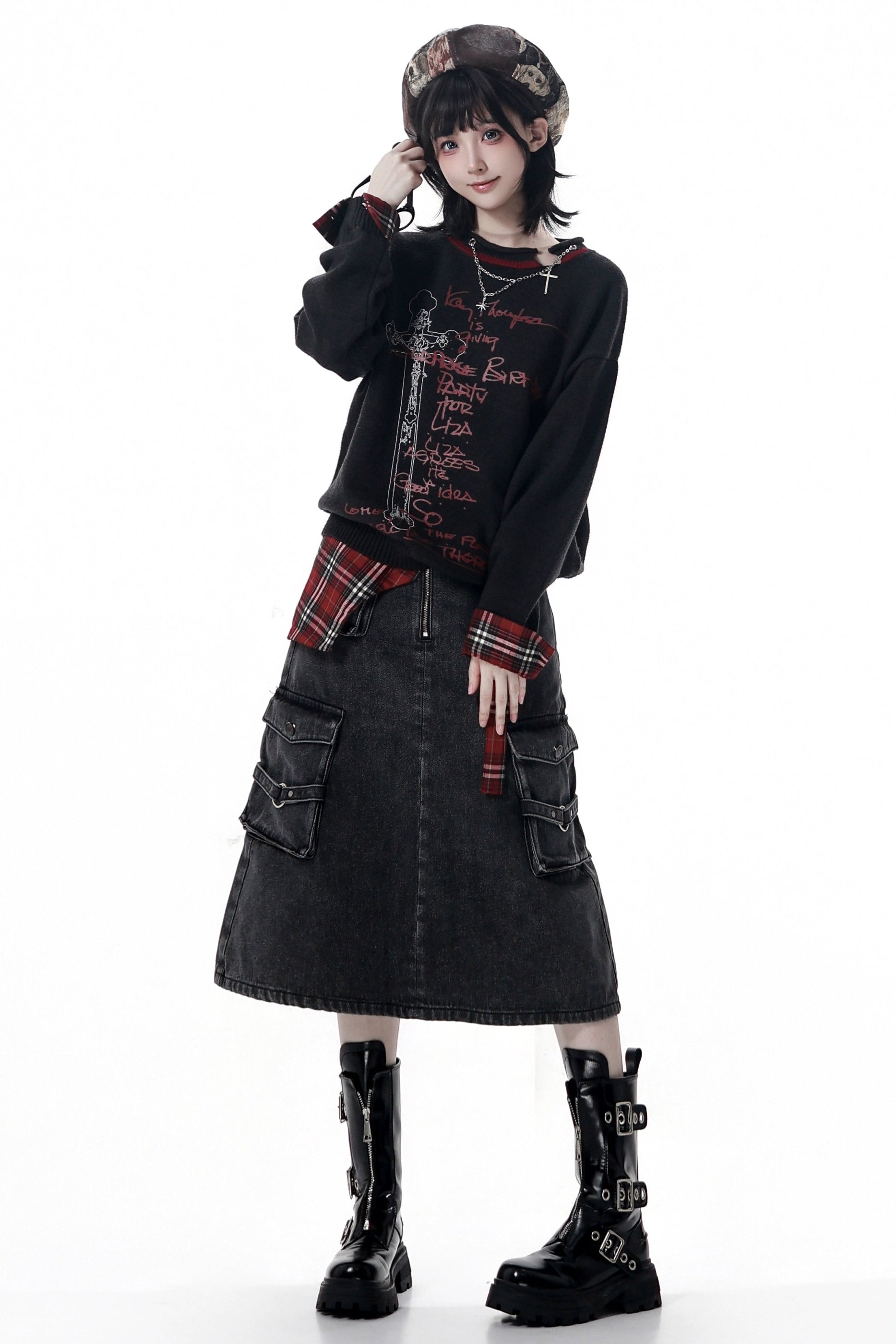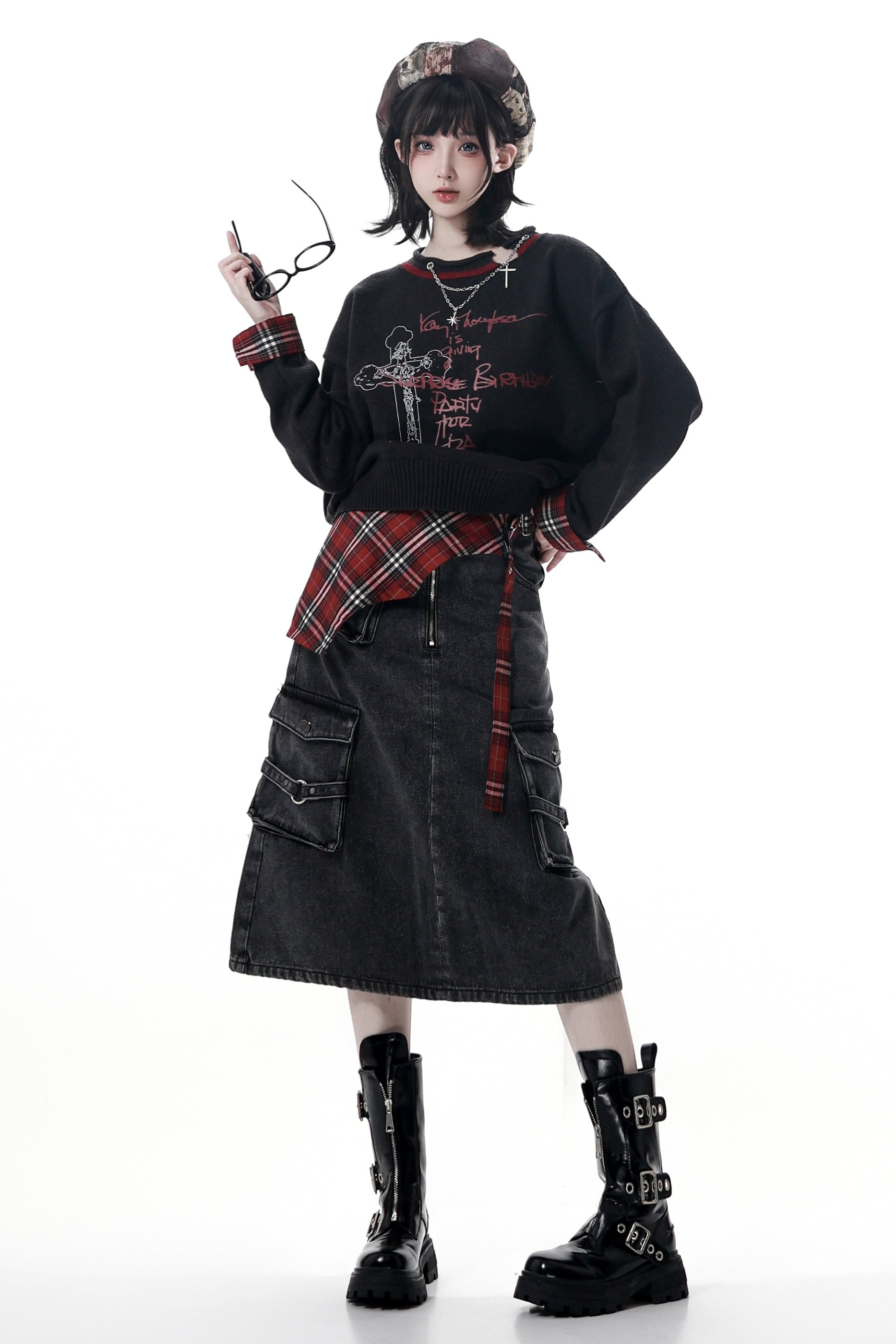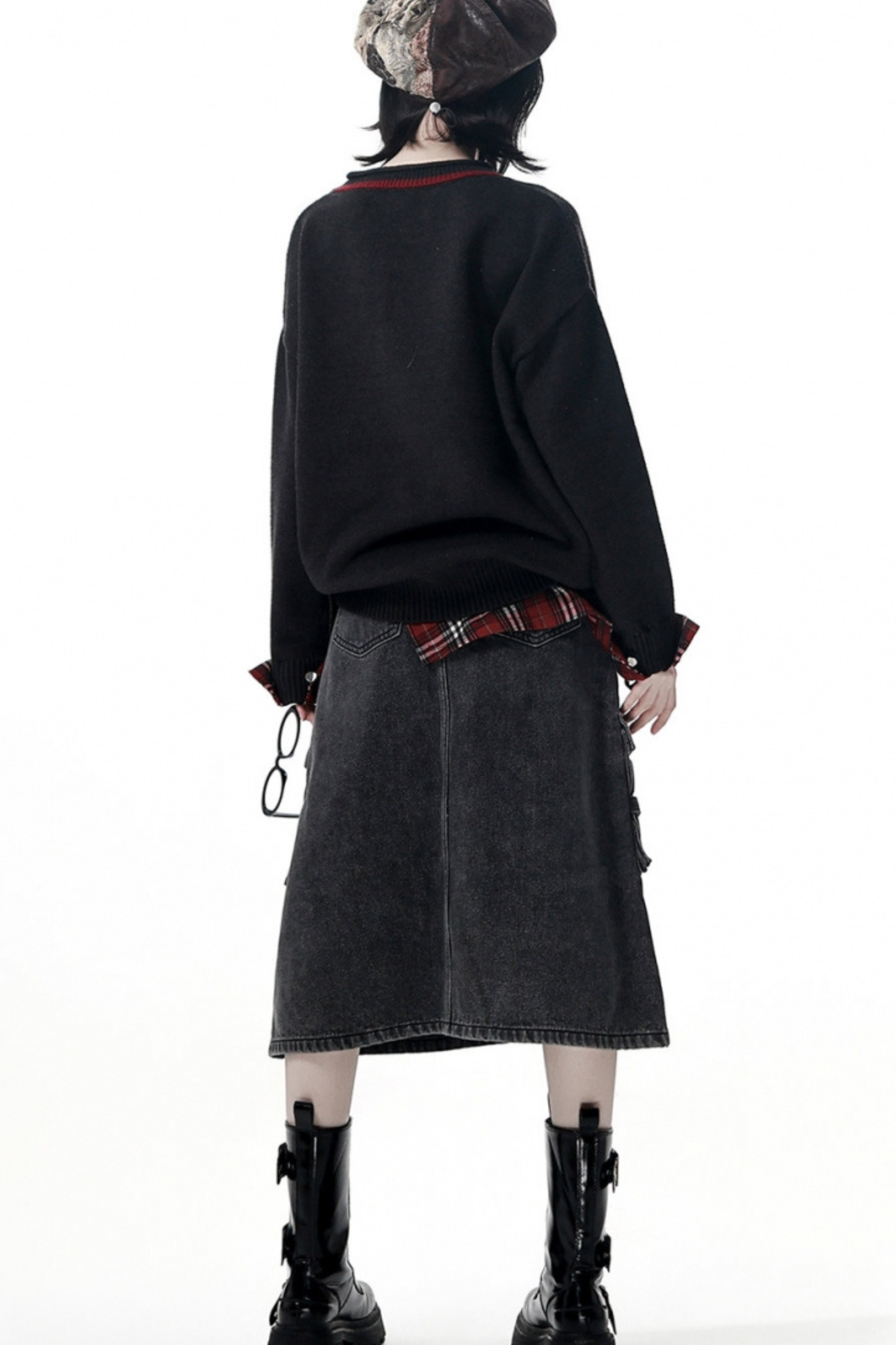 ダークトップス+デニムスカート+チェックウエストアクセサリー