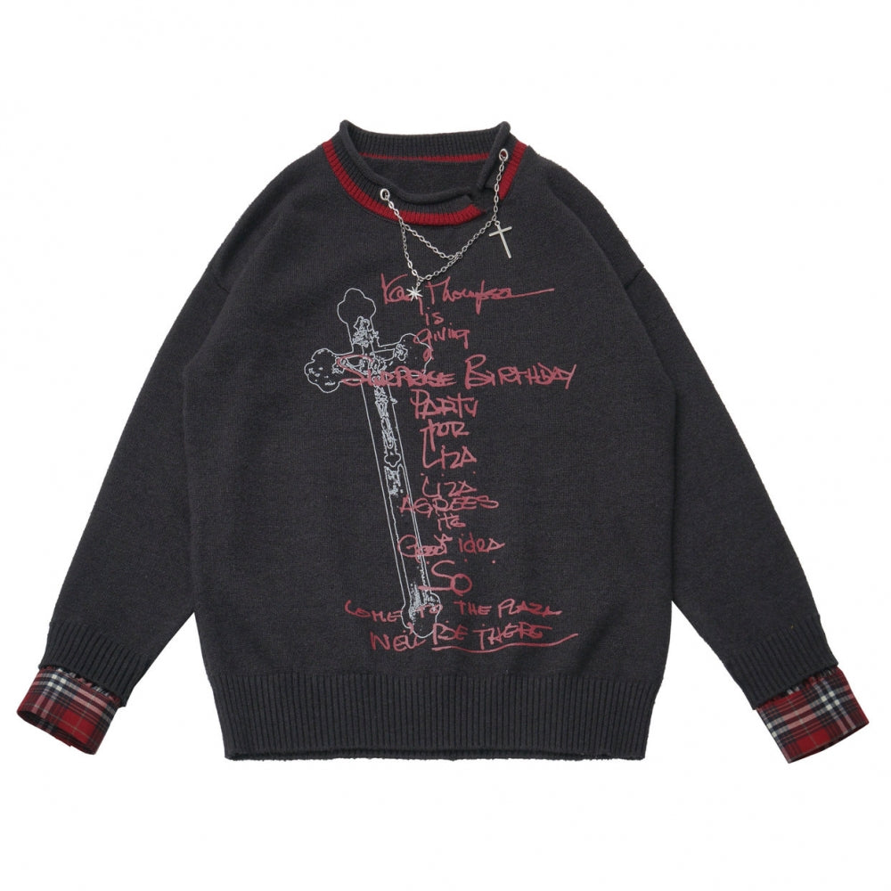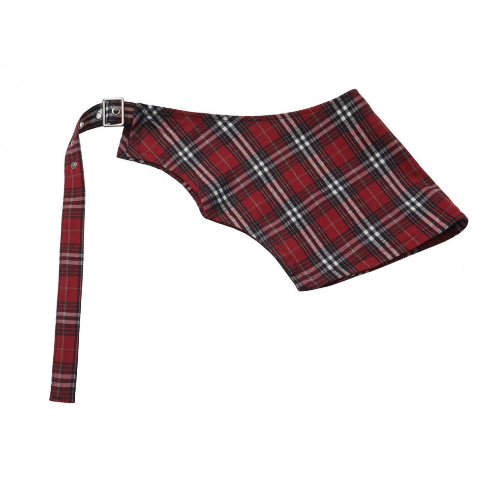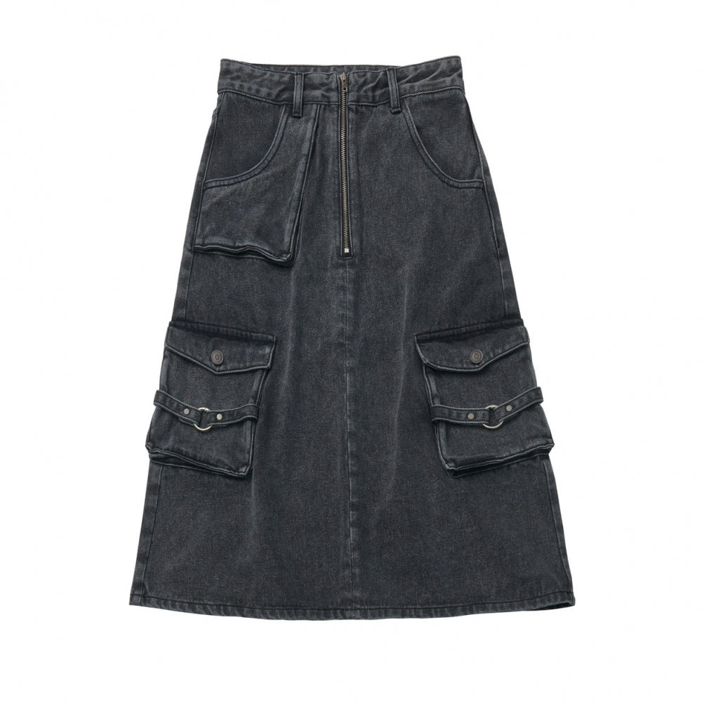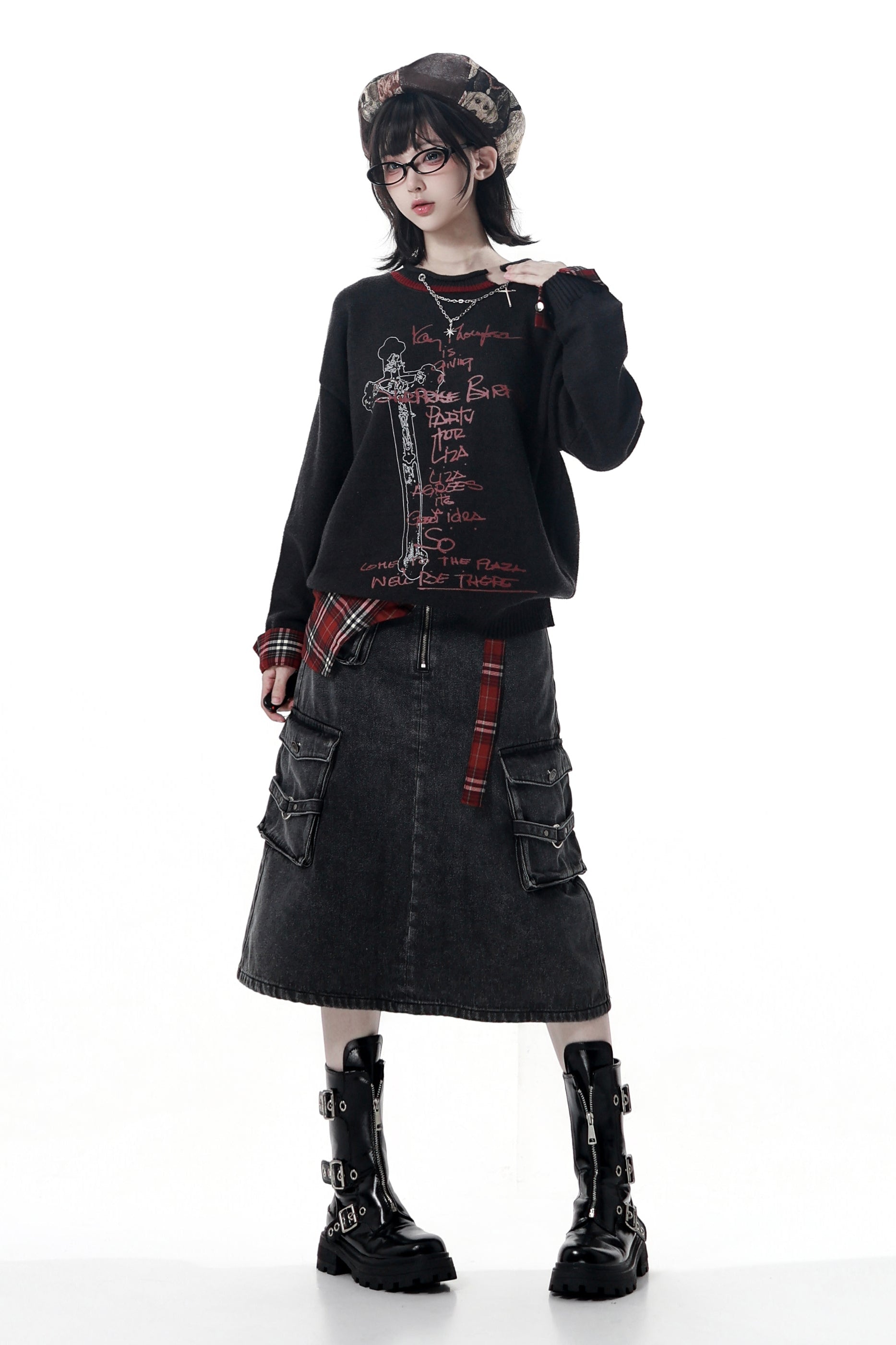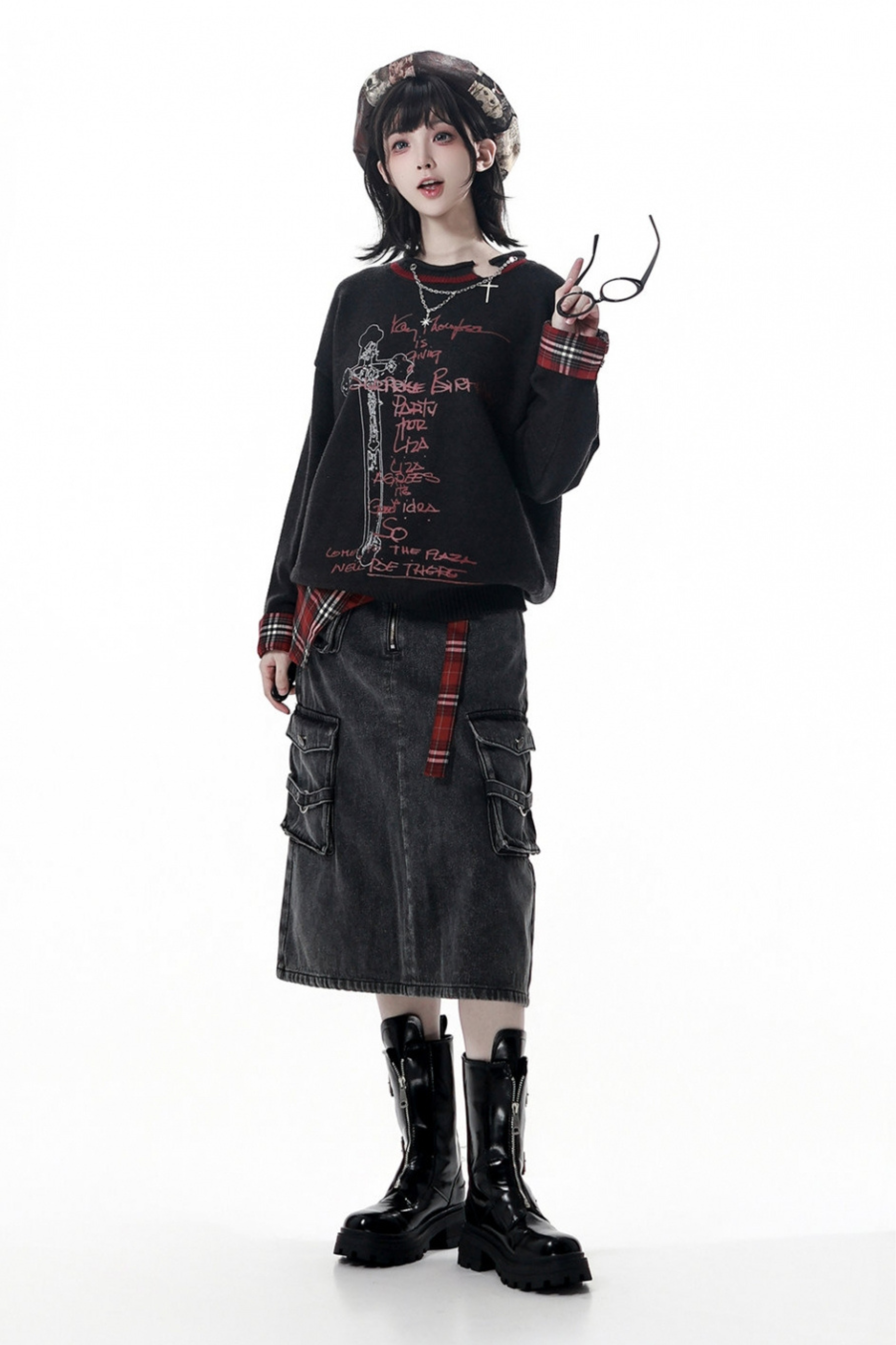 ダークトップス+デニムスカート+チェックウエストアクセサリー