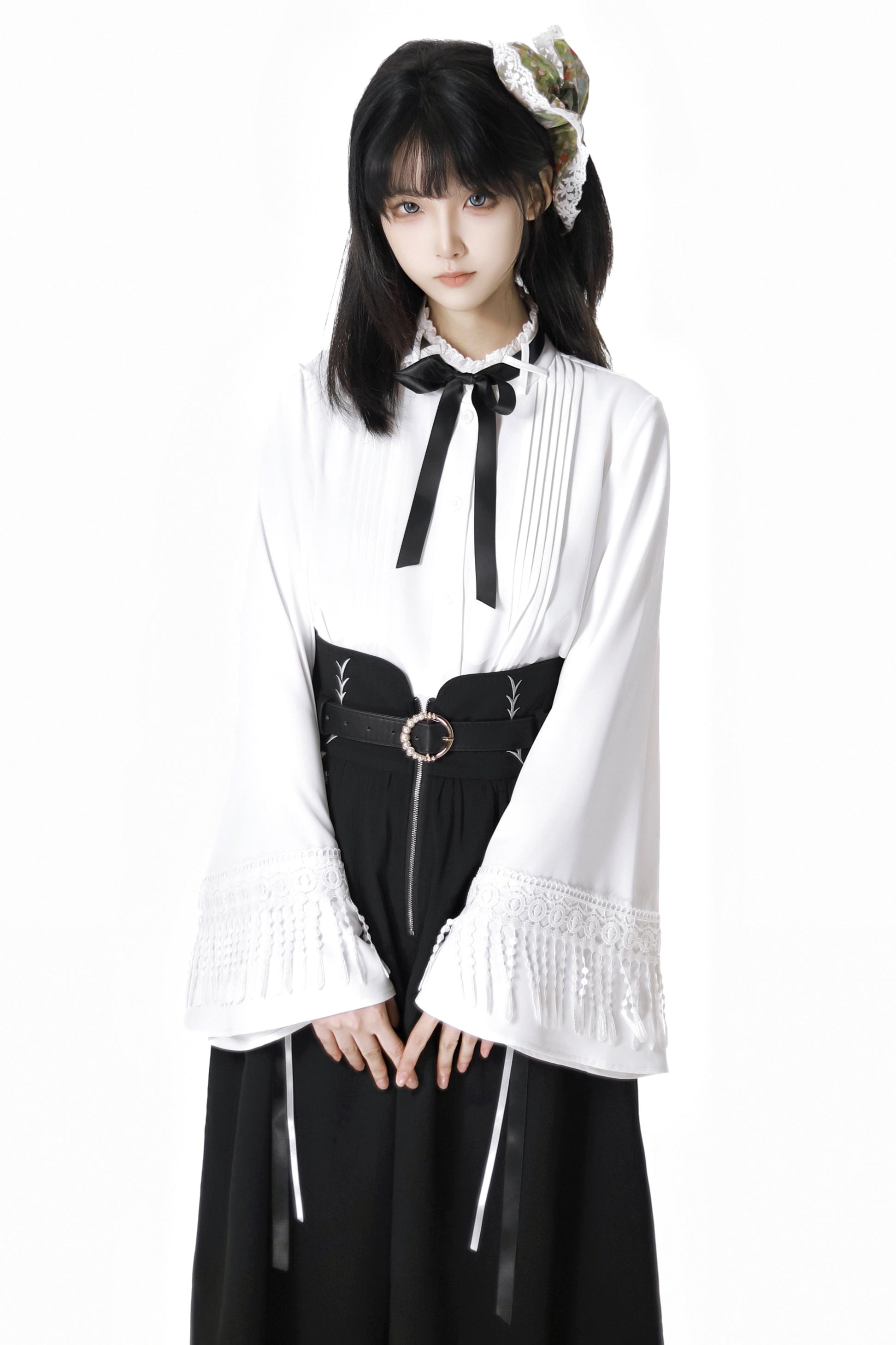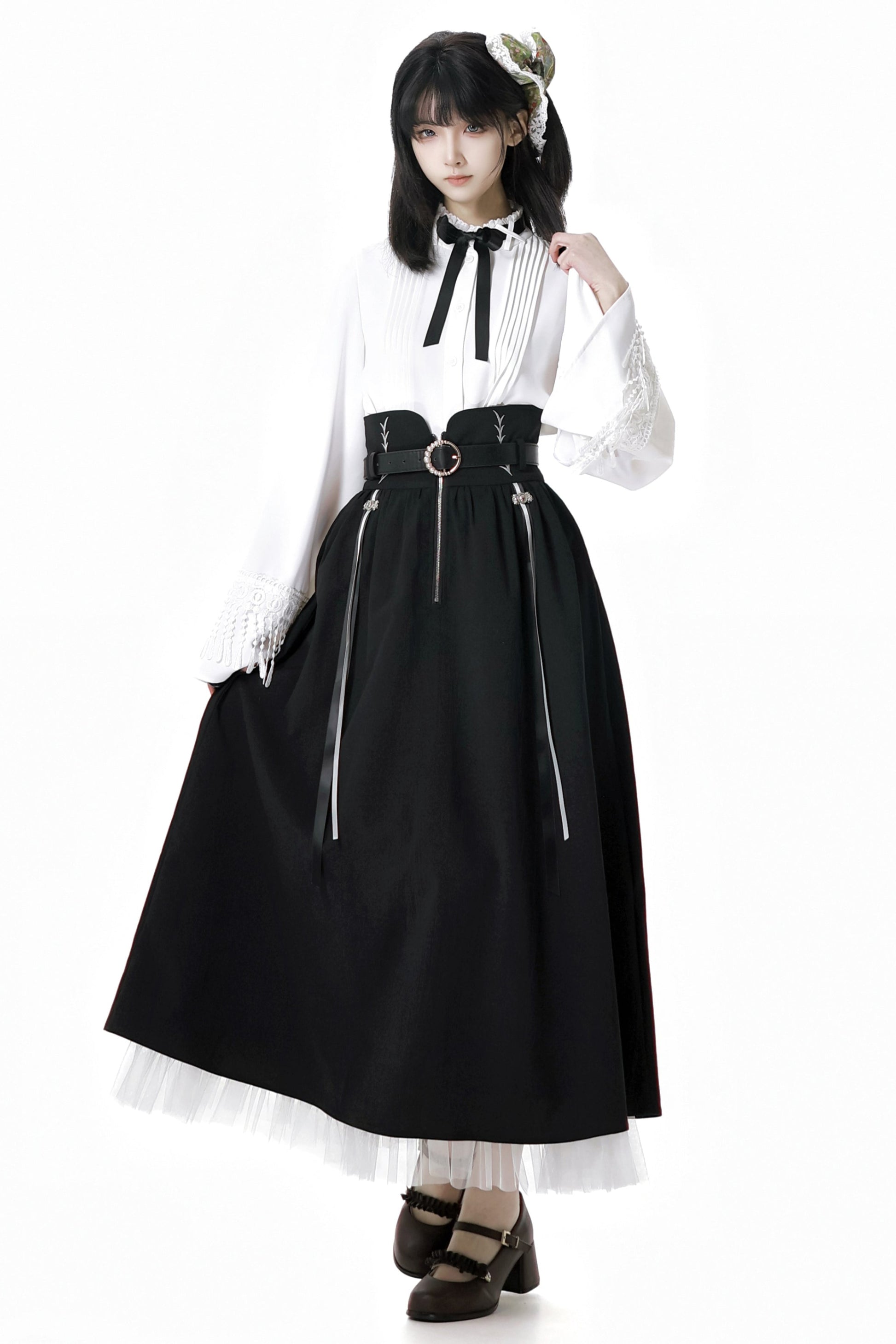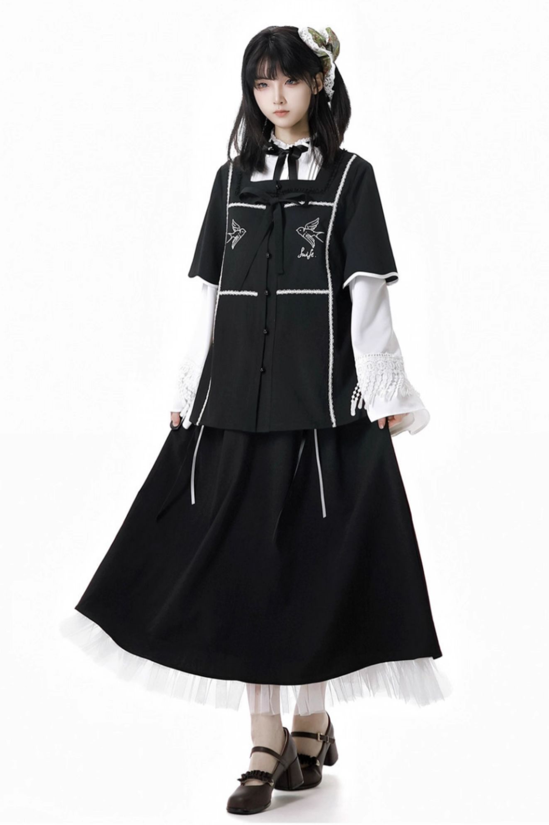 ダークモードスクエアネックカーディガン+シャツ+ロングスカート