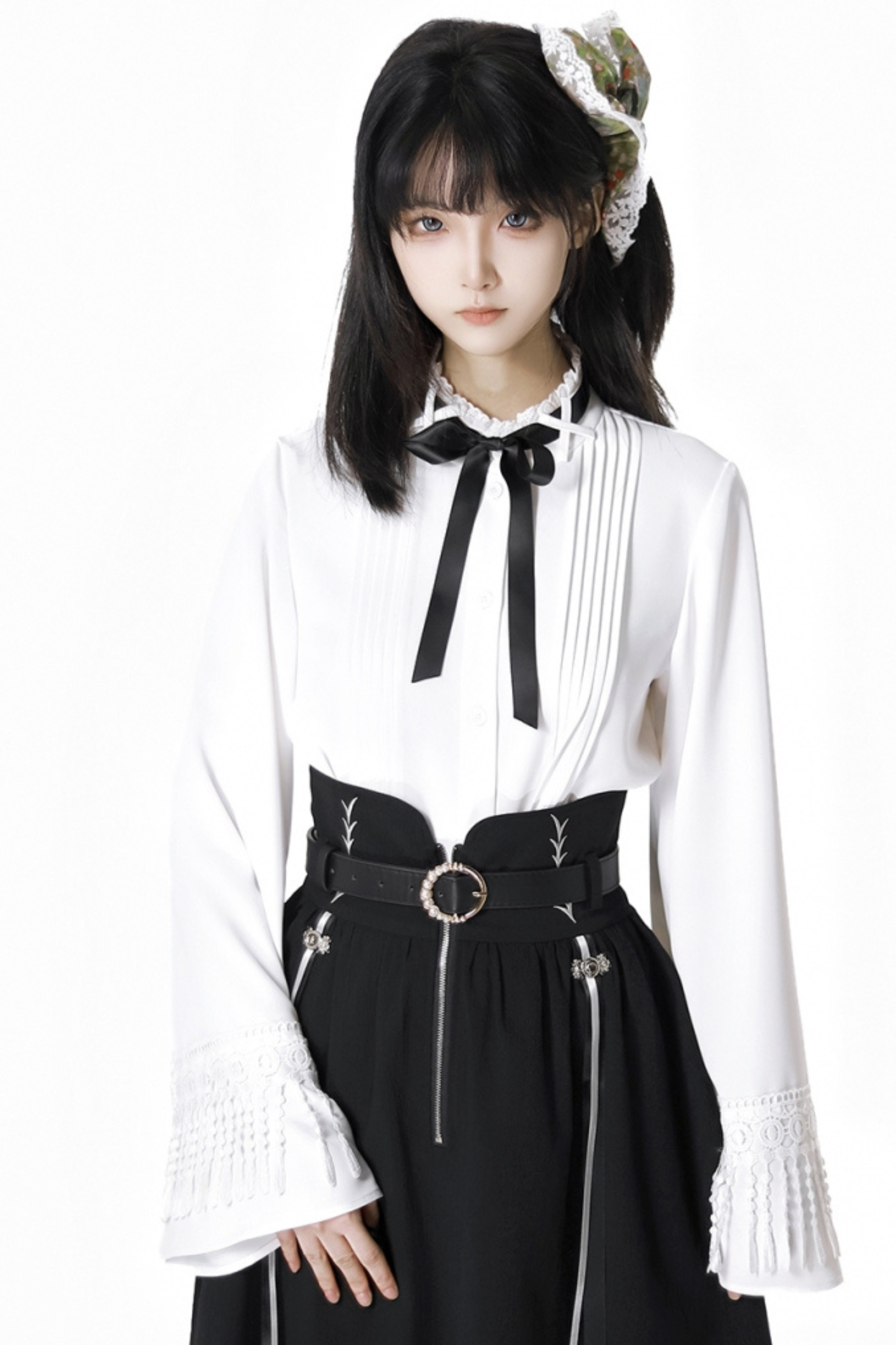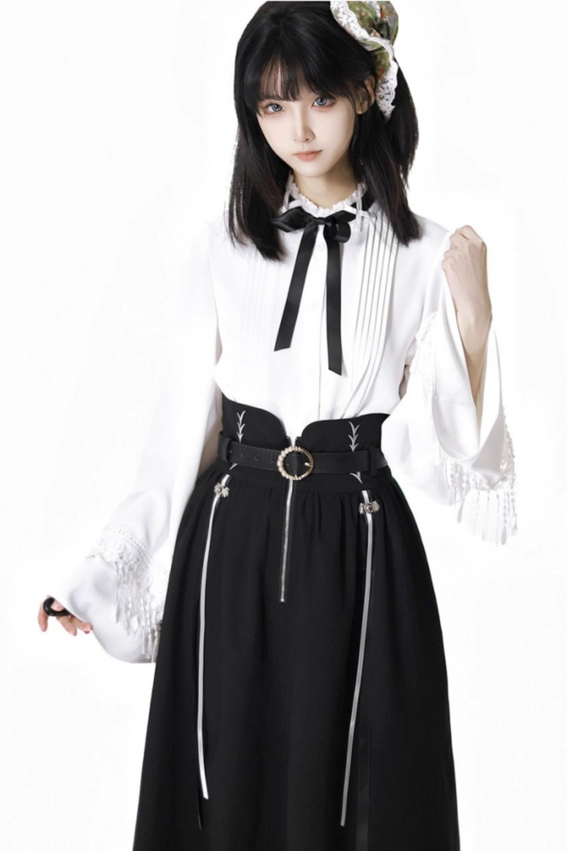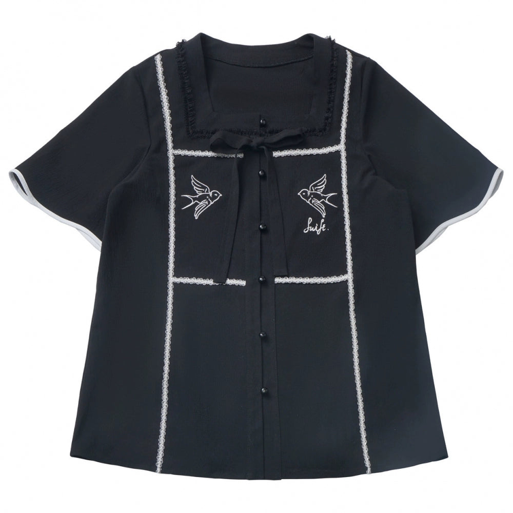 ダークモードスクエアネックカーディガン+シャツ+ロングスカート